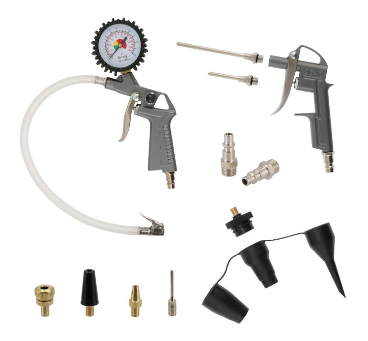 Sada pneumatického nářadí s kompresorem obsahuje 2pístovou ofukovací pistoli, pistoli na huštění pneumatik s manometrem, 2 náhradní rychlospojky a sadu 8 trysek na vyfukování míčů, pneumatik jízdních kol, nafukovacích předmětů a dalších předmětů.