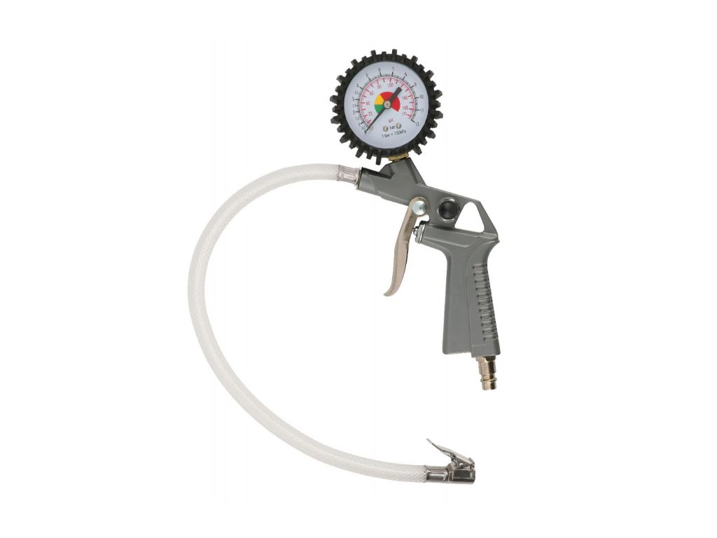 - Pistole na huštění pneumatik s gumovou hadicí. Tlakoměr s ochrannou gumovou vrstvou chránící číselník před poškozením. -