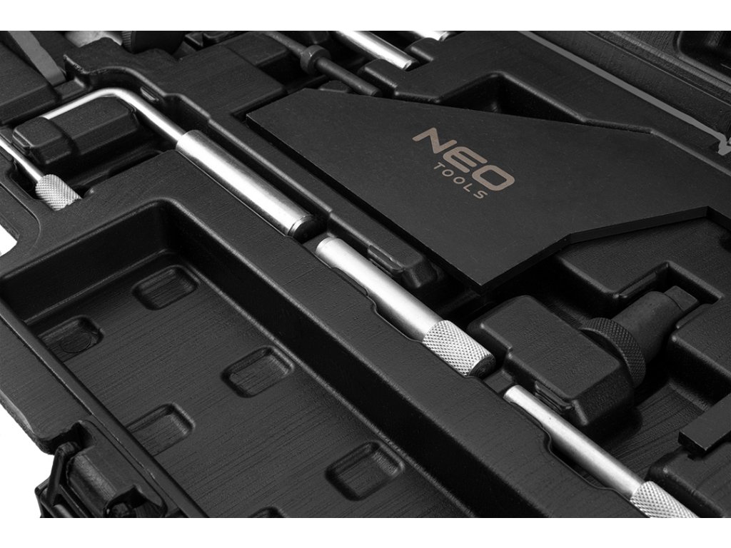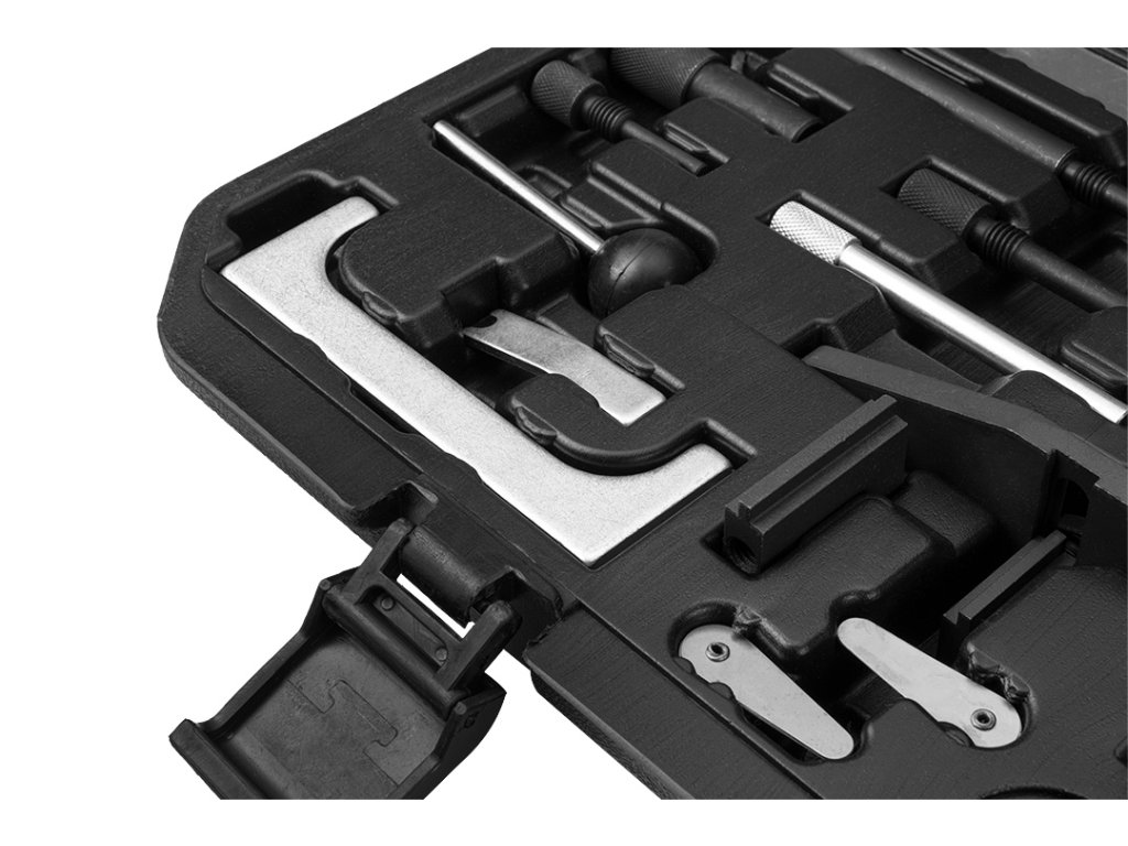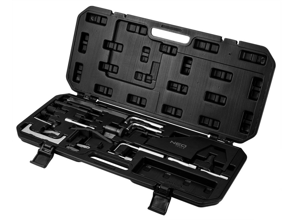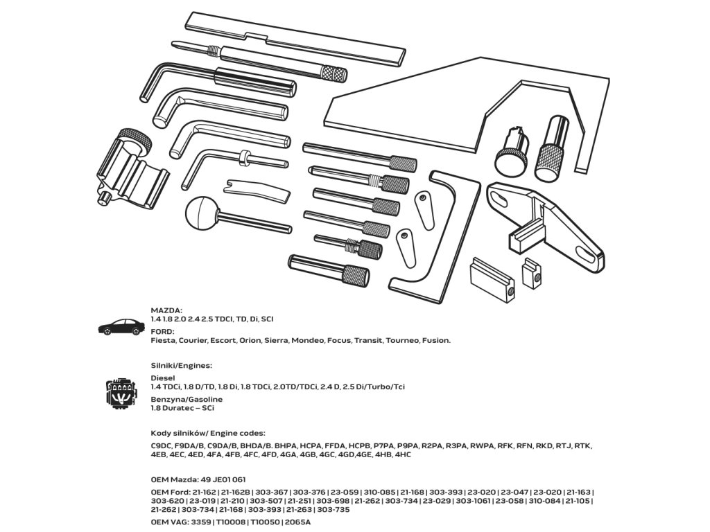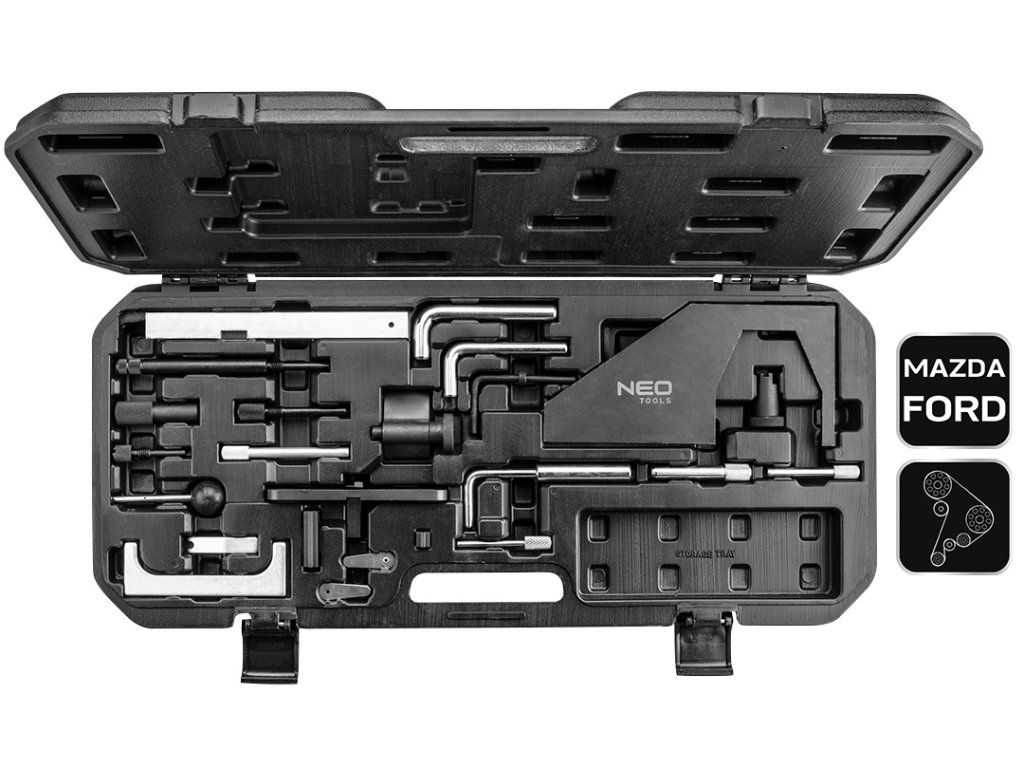 Souprava pro blokování rozvodů Mazda/Ford NEO pro benzinová a dieselová vozidla je sada nástrojů pro blokování rozvodů na vozidlech Mazda/Ford. Sada obsahuje prvky pro blokování rozvodového kola v benzinových a dieselových motorech.
