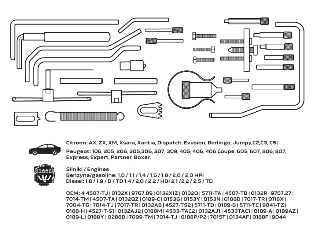 Sada pro blokování rozvodů benzinových a naftových motorů PSA NEO je sada nástrojů pro blokování rozvodových kol vozidel skupiny PSA. Souprava obsahuje prvky pro blokování rozvodovky v benzinových a dieselových motorech. Poskytuje základní nástroje pro nastavení a blokování motoru. Souprava je zabalena v kufříku