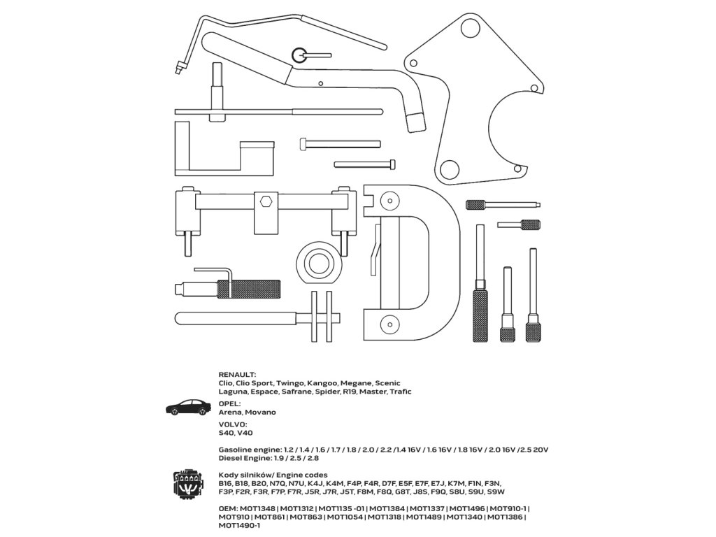 RENAULT: Clio, Clio Sport, Twingo, Kangoo, Megane, Scenic Laguna, Espace, Safrane, Spider, R19, Master, TraficOPEL: Arena, MovanoVOLO: S40, V40 Benzínový motor: 1.2 / 1.4 / 1.6 / 1.7 / 1.8. / 1.6 16V / 1.8 16V / 2.0 16V /2.5 20V dieselový motor: 1.9 / 2.5 / 2.8Kódy motorů F1N, F3N, F3P, F2R, F3R, F7P, F7R, J5R, J7R, J5T, F8M, F8Q, G8T, J8S, F9Q, S8U, S9U, S9WOEM: MOT1348 | MOT1312 | MOT1135 -01 | MOT1384 | MOT1337 | MOT1496 | MOT910-1 | MOT910 | MOT861 | MOT863 | MOT1054 | MOT1318 | MOT1489 | MOT1340 | MOT1386 | MOT1490-1