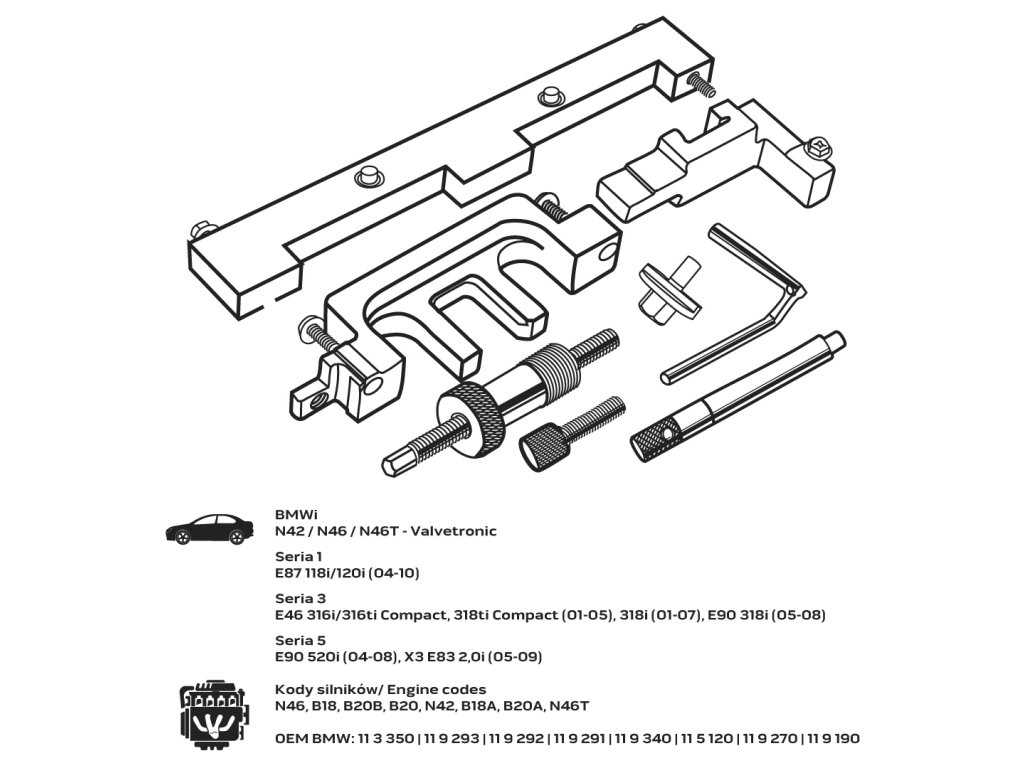 Sada pro blokování rozvodových kol Valvetronic pro benzinové motory BMW NEO je sada nástrojů pro blokování rozvodových kol ve vozidlech BMW. Souprava obsahuje prvky pro blokování rozvodového ústrojí v benzinových motorech se systémem Valvetronic. Poskytuje základní nástroje pro nastavení a blokování motoru. Souprava je zabalena v kufříku.