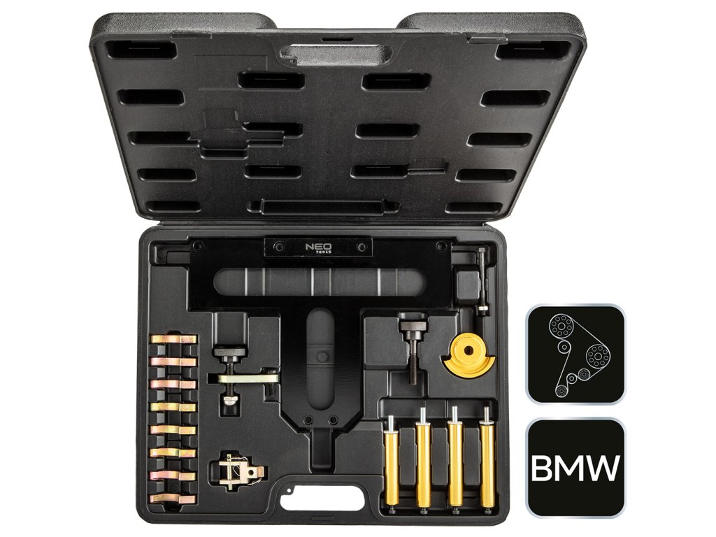 Sada pro blokování rozvodů benzinových motorů BMW NEO je sada nástrojů pro blokování rozvodových kol ve vozidlech BMW. Souprava obsahuje prvky pro blokování rozvodového kola v benzinových motorech. Poskytuje základní nástroje pro nastavení a blokování motoru. Souprava je zabalena v kufříku.