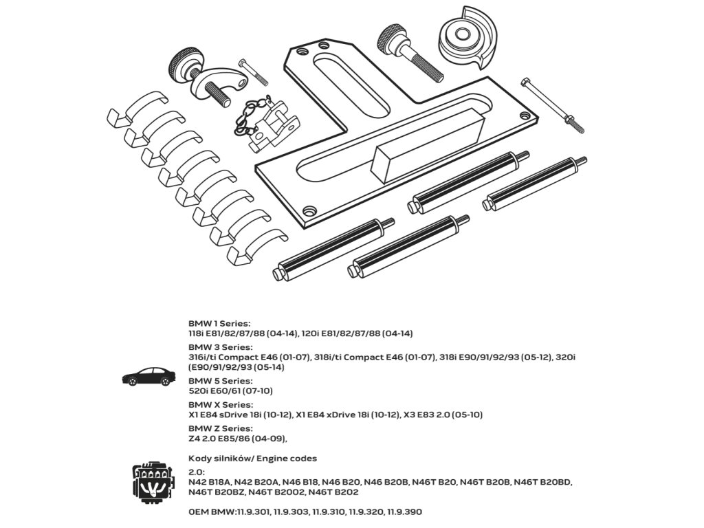 BMW řady 1:118i E81/82/87/88 (04-14), 120i E81/82/87/88 (04-14) BMW řady 3:316i/ti Compact E46 (01-07), 318i/ti Compact E46 (01-07 (05-12), 320i (E90/91/92/93 (05-14) BMW řady 5:520i E60/61 (07-10) BMW řady X:X1 E84 sDrive 18i (10-12), X1 E84 xDrive 18i (10-12) Z:Z4 2.0 E85/86 (04-09), Kódy motoru2.0:N42 B18A, N42 B20, N46 B18, N46 B20, N46 B20B, N46T B20, N46T B20B, N46T B20BD, N46 B2O2OEM BMW:11.9.301, 11.9.303, 11.9.310, 11.9.320, 11.9.390