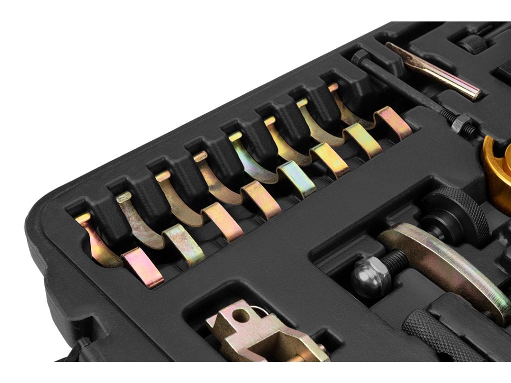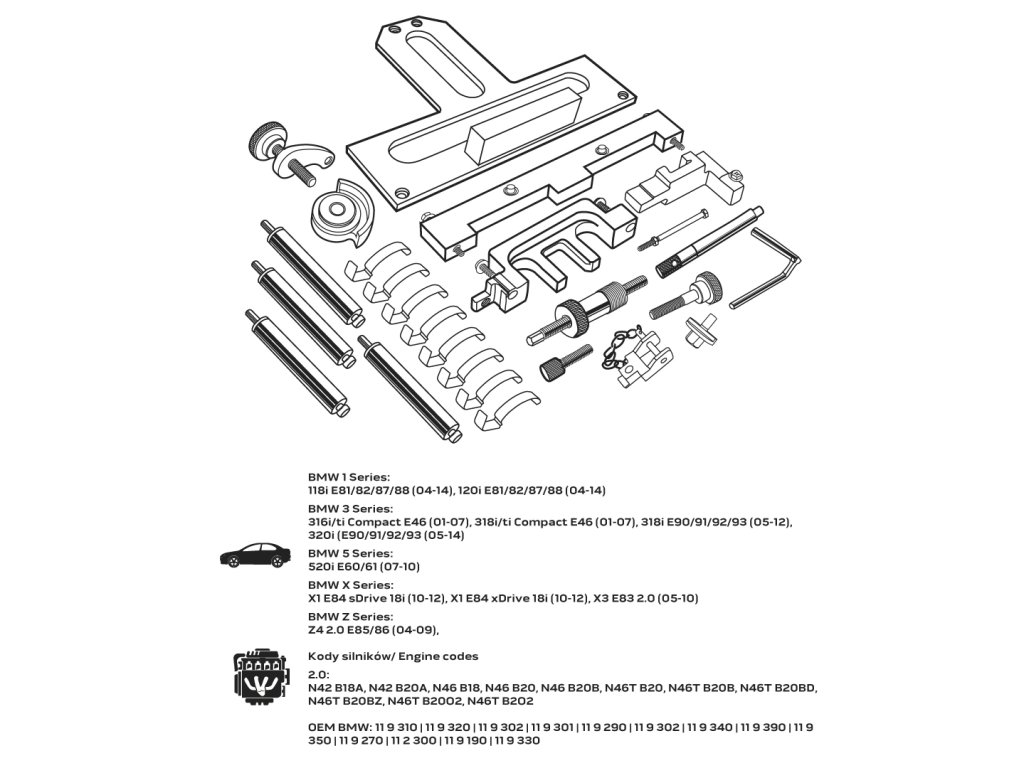Sada pro blokování rozvodů benzinových motorů BMW NEO je sada nástrojů pro blokování rozvodových kol v automobilech BMW. Souprava obsahuje prvky pro blokování rozvodového kola v benzinových motorech. Poskytuje základní nástroje pro nastavení a blokování motoru. Souprava je zabalena v kufříku.