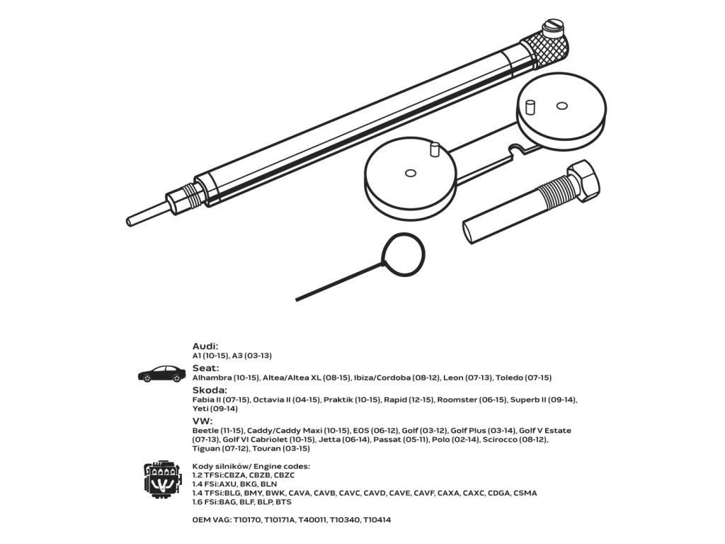 Audi:A1 (10-15), A3 (03-13)Seat:Alhambra (10-15), Altea/Altea XL (08-15), Ibiza/Cordoba (08-12), Leon (07-13), Toledo (07-15)Škoda:Fabia II (07-15) (10-15), Rapid (12-15), Roomster (06-15), Superb II (09-14), Yeti (09-14). (07-13), Golf VI Cabriolet (10-15), Jetta (06-14), Passat (05-11), Polo (02-14), Scirocco (08-12), Tiguan (07-12), Touran (03-15) Kódy motorů: 1,2 CBSi. FSi:AXU, BKG, BLN1.4 TFSi:BLG, BMY, BWK, CAVA, CAVB, CAVC, CAVD, CAVE, CAVF, CAXA, CAXC, CDGA, CSMA1.6 FSSi:BAG, BLF, BLP, BTSOEM VAG: T10170, 101 T10414