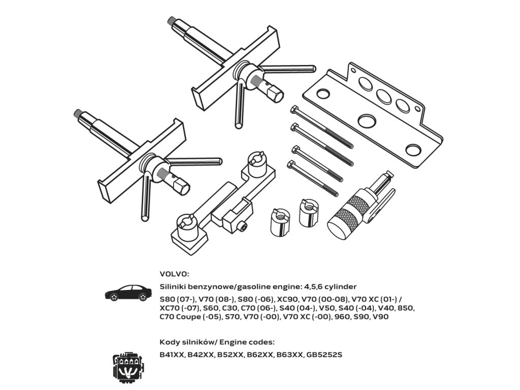 Sada pro blokování rozvodů benzinových motorů Volvo NEO je sada nástrojů pro blokování rozvodových kol vozů Volvo. Souprava obsahuje položky pro blokování rozvodového kola benzinových motorů. Poskytuje základní nástroje pro nastavení a blokování motoru. Souprava je zabalena v kufříku.