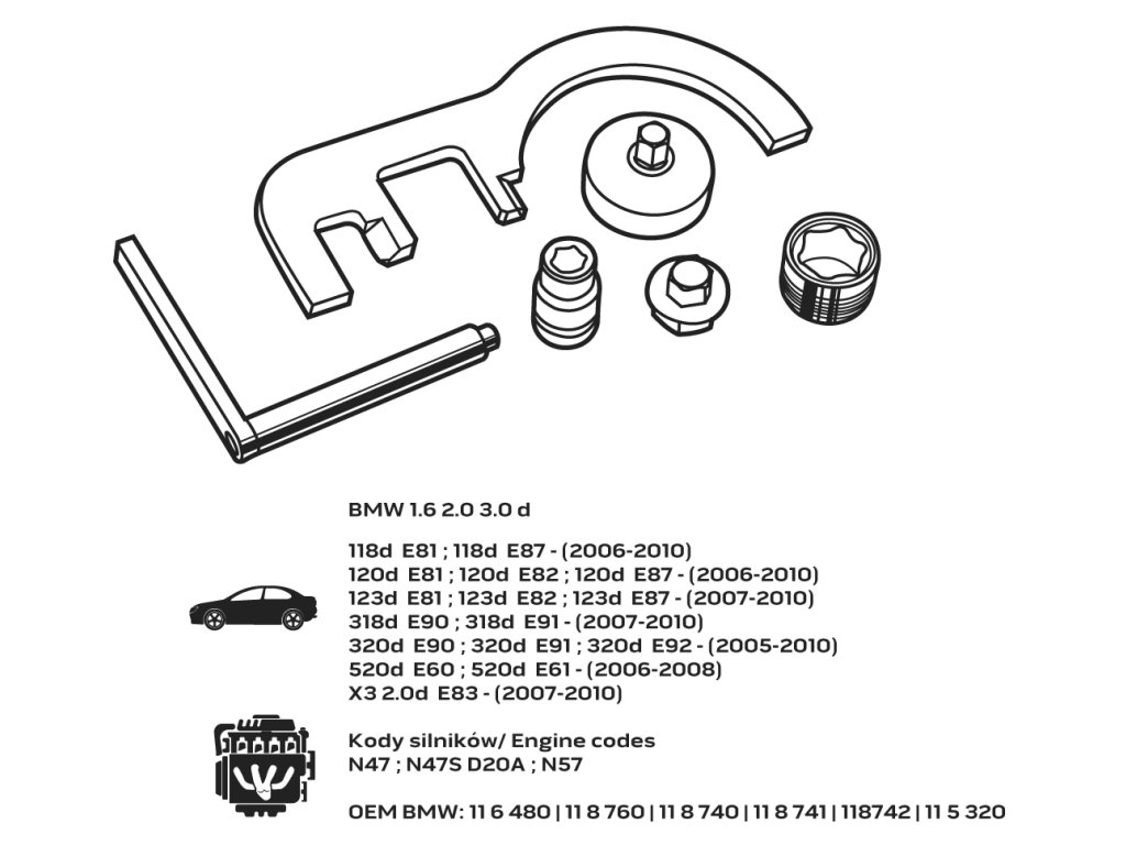 BMW 1.6 2.0 3.0 d118d E81; 118d E87 - (2006-2010)120d E81 ; 120d E82 ; 120d E87 - (2006-2010)123d E81 ; 123d E82 ; 123d E87 - (2007-2010)318d E90 ; 318d E91 - (2007-2010)320d E90 ; 320d E91 ; 320d E92 - (2005-2010)520d E60 ; 520d E61 - (2006-2008)X3 2.0d E83 - (2007-2010)Kódy motorůN47 ; N47S D20A ; N57OEM BMW: 11 6 480 | 11 8 760 | 11 8 740 | 11 8 741 | 118742 | 11 5 320