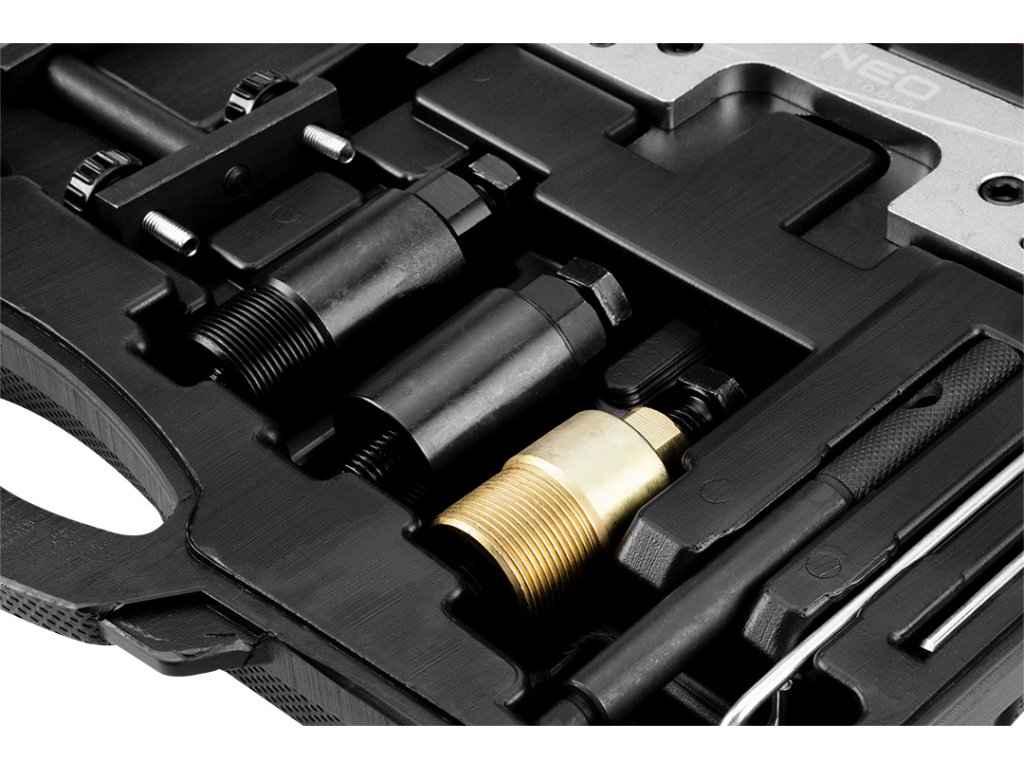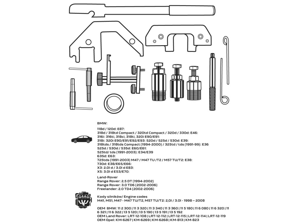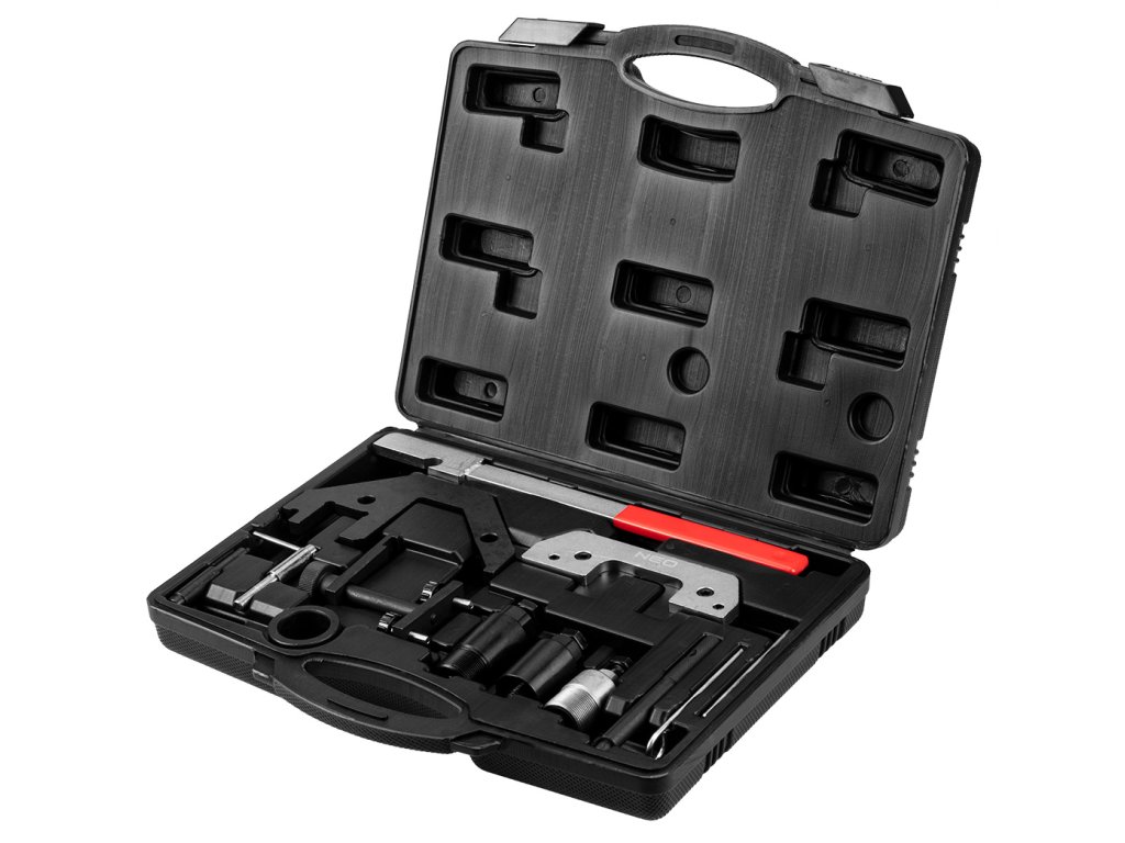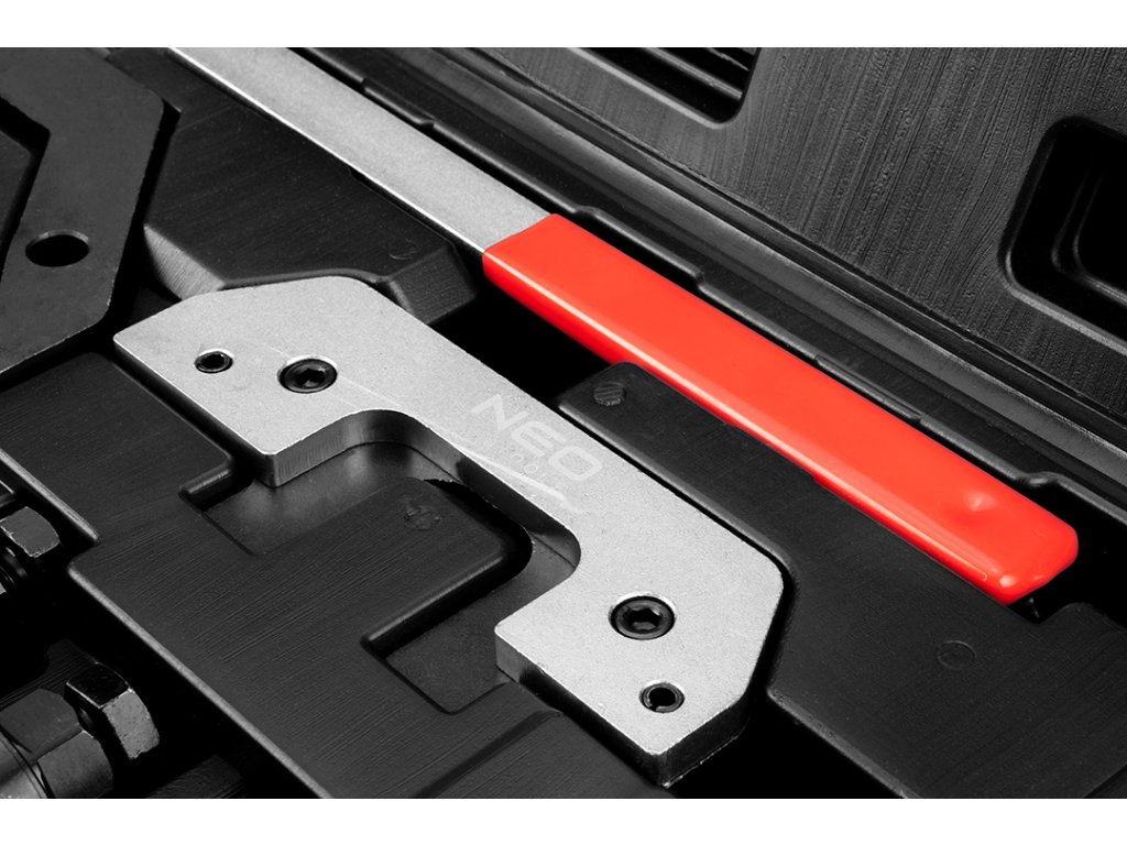 Souprava NEO BMW dieselový rozvodový zámek je sada nástrojů pro blokování rozvodových kol vozů BMW, jakož i vozů Land Rover. Souprava obsahuje prvky pro blokování rozvodovky v dieselových motorech. Poskytuje základní nástroje pro nastavení a blokování motoru. Souprava je zabalena v kufříku.