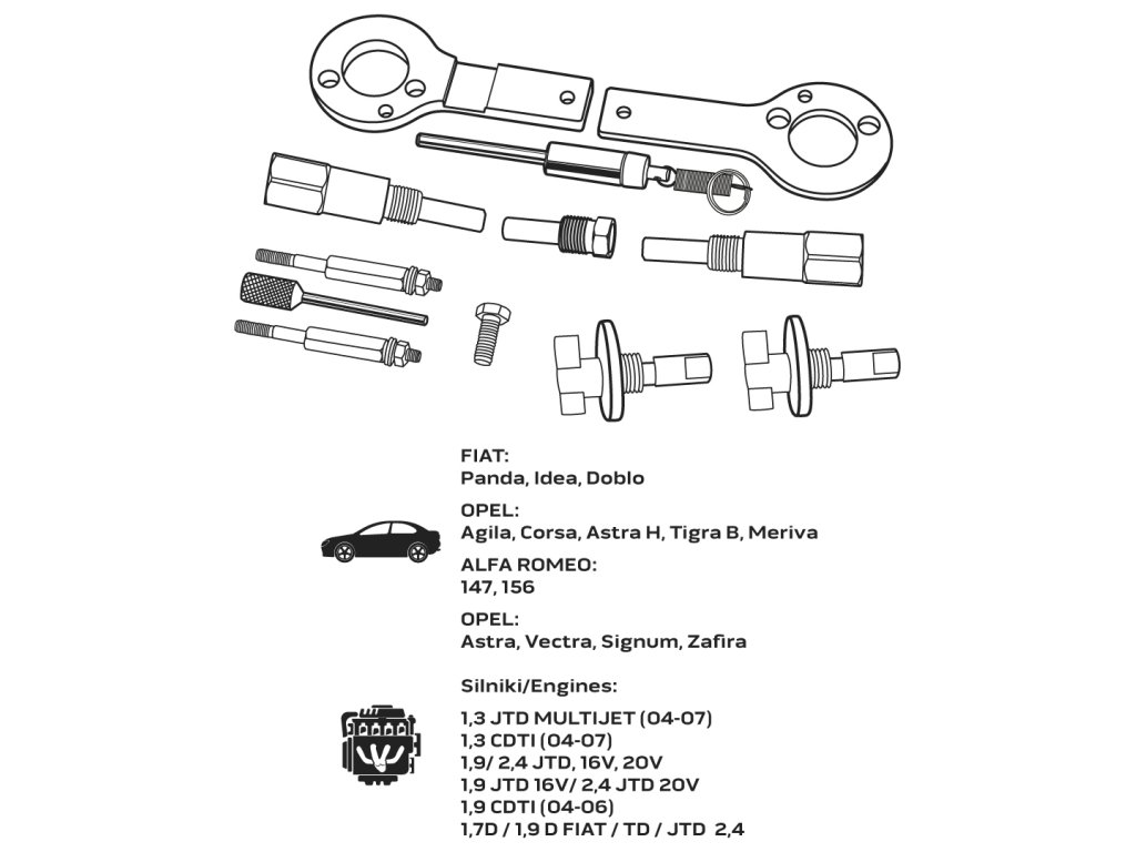 Souprava pro blokování rozvodových kol Fiat/GM diesel NEO je sada nástrojů pro blokování rozvodových kol v automobilech Fiat a GM. Souprava obsahuje prvky pro blokování rozvodových kol v dieselových motorech. Poskytuje základní nástroje pro nastavení a zablokování motoru. Souprava je balena v kufříku