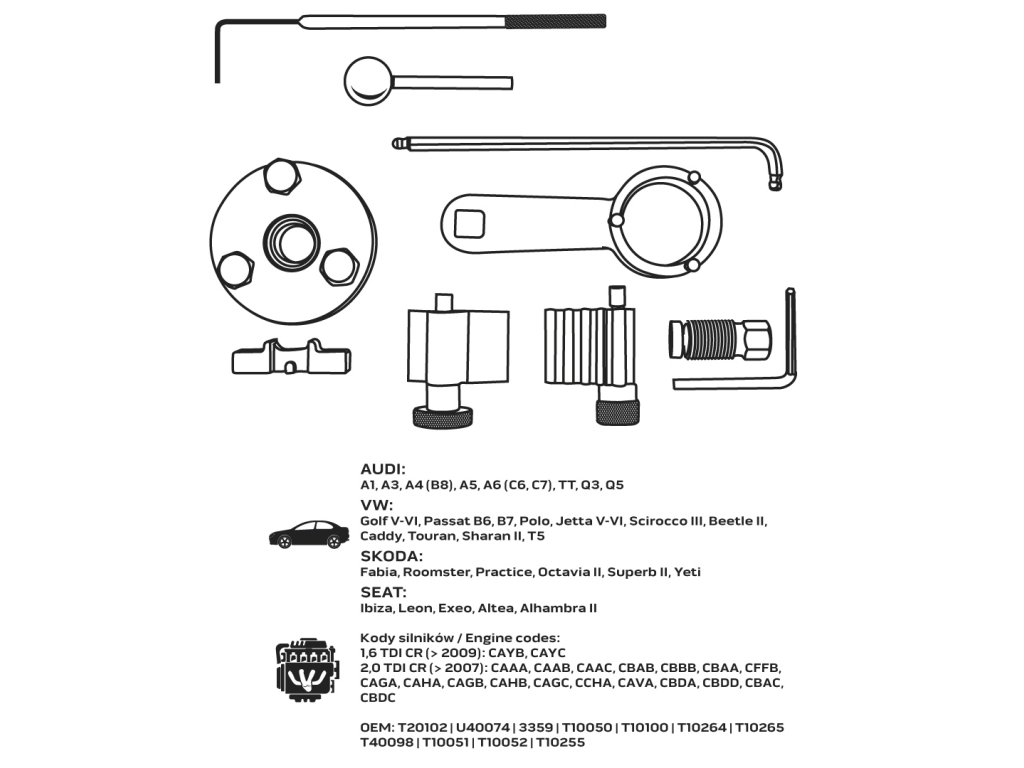 AUDI A1, A3, A4 (B8), A5, A6 (C6, C7), TT, Q3, Q5VW Golf V-VI, Passat B6 B7, Polo, Jetta V-VI, Scirocco III, Beetle II, Caddy, Touran, Sharan II, T5SKODA Fabia, Roomster, Práce Leon, Exeo, Altea, Alhambra IIKódy motorů / Kódy motorů1,6 TDI CR (> 2009): CAYB, CAYC2,0 TDI CR (> 2007): CAAA, CAAB, CAAC, CBAB, CBB, CBAA, CFFB, CAGA, CAHA, CAGB, CAH CBAC, CBDCOEM: T20102 | U40074 | 3359 | T10050 | T10100 | T10264 | T10265 T40098 | T10051 | T10052 | T10255
