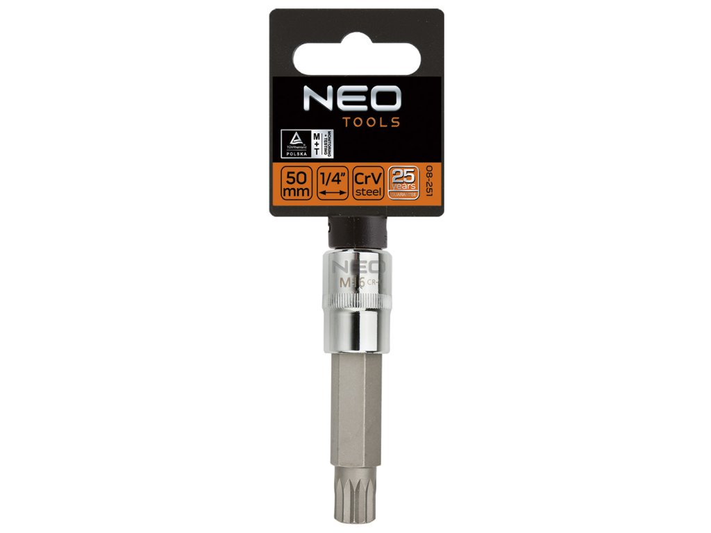 Drážkovací hrot na 1/2" nástrčné hlavice NEO (ořech) (ref. 08-740) velikost M5, délka 100 mm. Zásuvka je vyrobena z odolné chrom-vanadiové oceli. Šestihranné zakončení z vysoce kvalitní legované oceli S2. 25-letá záruka výrobce.