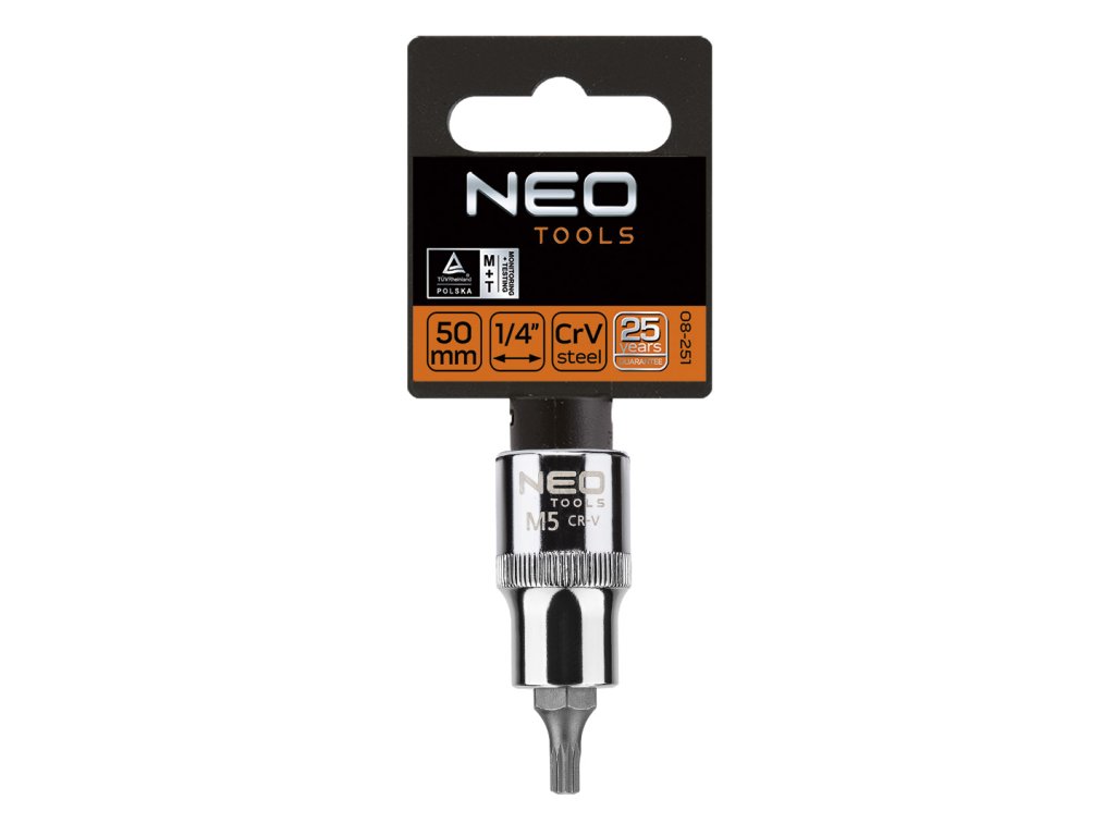 Drážkovací hrot na 1/2" nástrčku NEO (ořech) (ref. 08-730) velikost M5, délka 55 mm. Zásuvka je vyrobena z odolné chrom-vanadiové oceli. Šestihranné zakončení z vysoce kvalitní legované oceli S2. 25-letá záruka výrobce potvrzuje vyso.