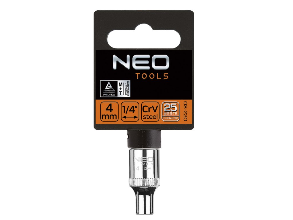 1/4" šestihranná objímka NEO (ref. 08-220) velikosti 4 mm, vyrobená z odolné chrom-vanadové oceli dle normy DIN 3124. Konstrukce objímky dle technologie Superlock umožňuje uvolnění poškozených šroubů a chrání šrouby před deformací. Kvalitu nástroje potvrzuje certifikát očekávání profesionálů.