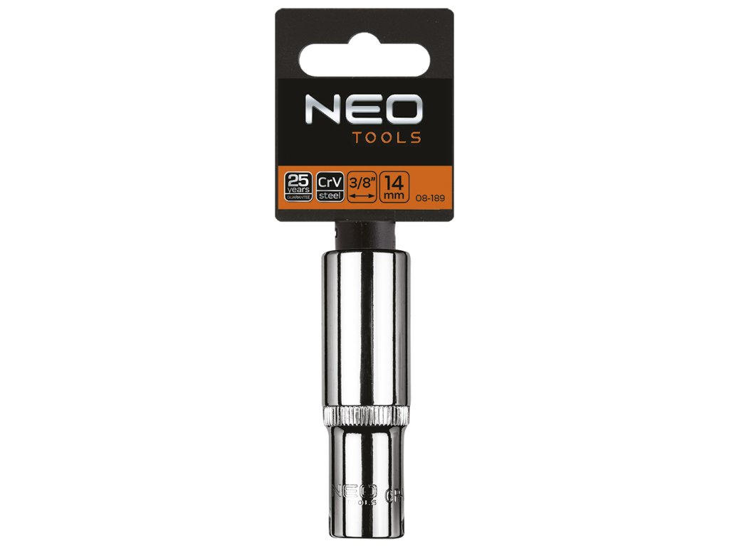 3/8" dlouhý šestihran 14 mm NEO (ref. 08-189) z odolné chrom-vanadiové oceli. Vlnitý povrch zlepšuje přilnavost zásuvky. Kvalitu nástroje potvrzuje 25letá záruka výrobce. Značka NEO splňuje očekávání profesionálů.