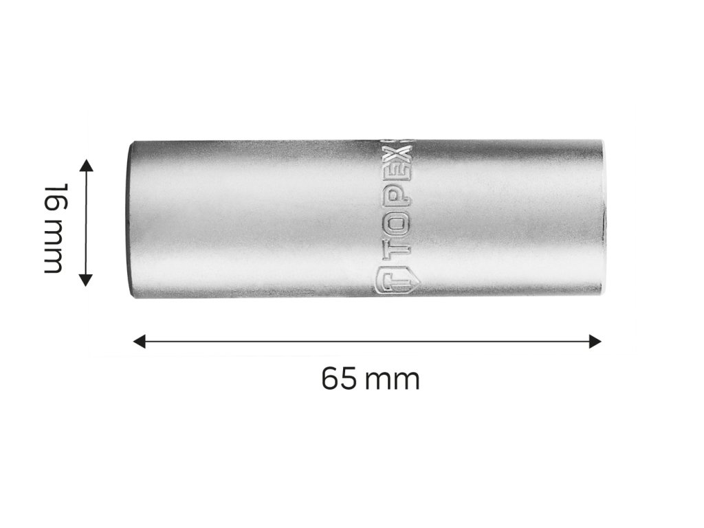 1/2" šestihran TOPEX (ref. 38D764) velikost 16 mm. Určeno pro šroubování a demontáž zapalovacích svíček v automobilech. Má standardní 1/2" zásuvku. Vyrobeno z odolné chrom-vanadiové oceli, která zaručuje dlouhou životnost výrobku. Značka TOPEX je určena pro domácí kutily.