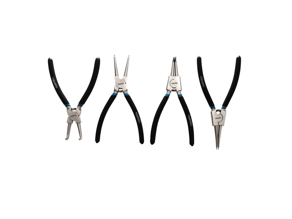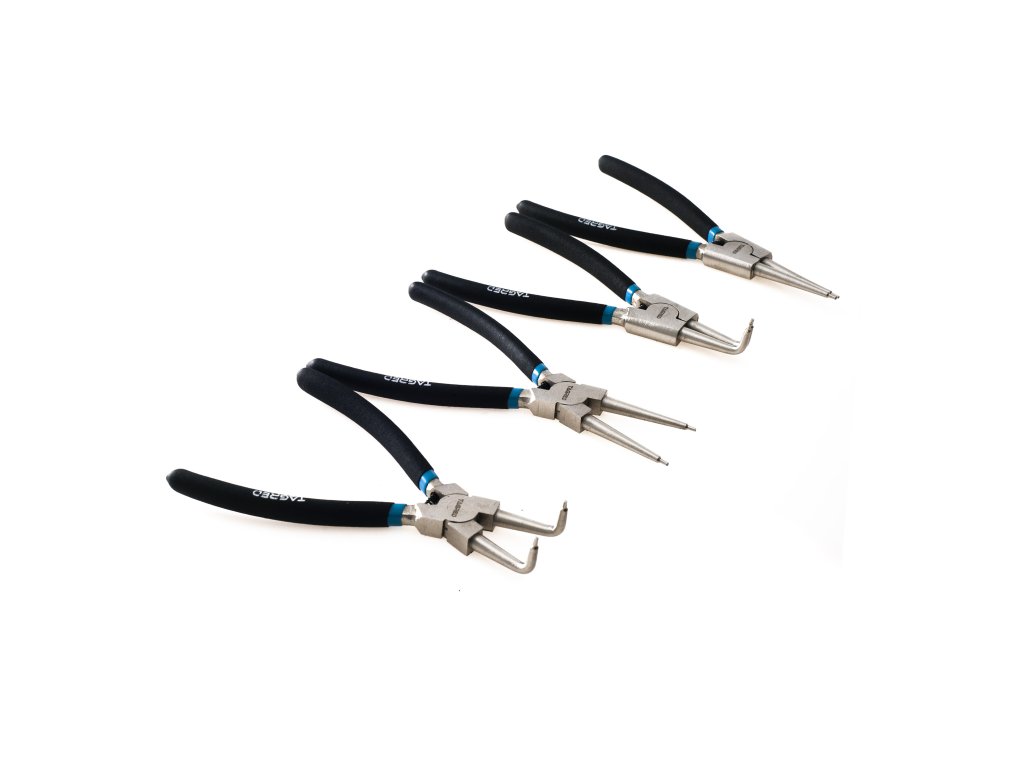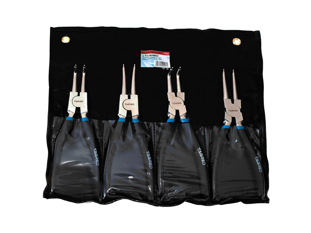 Souprava přizpůsobená pro práci s vnitřními a vnějšími kroužky. Obsahuje kleště s ohnutými a rovnými konci a 2 typy těchto pojistek: vnitřní (rozpínací uvnitř pouzdra) a vnější (svorkové, na vnější straně válce). Kleště jsou vyrobeny z odolné a pevné chrom-vanádové oceli a mají rukojeti potažené gumou. Jsou to vynikající nástroje pro montáž a demontáž pružných kroužků.