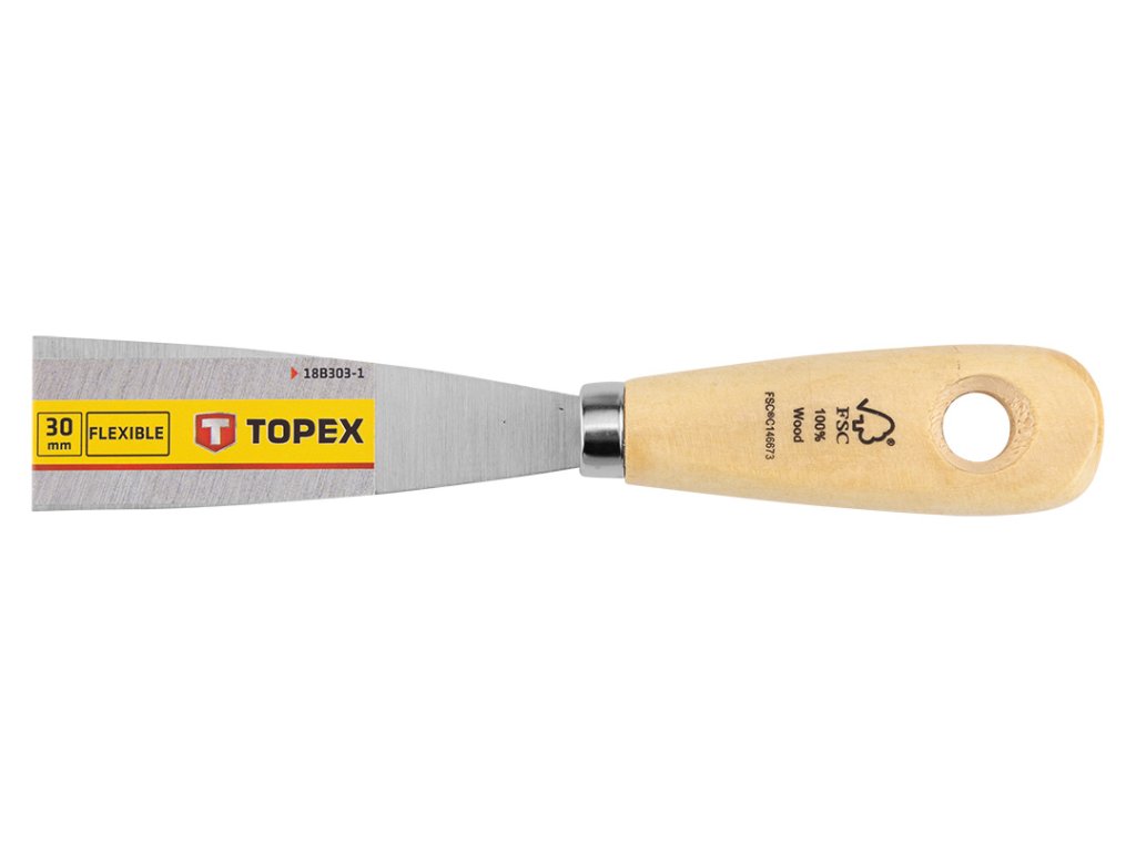 Malířská špachtle 30 mm 18B303-1 od společnosti TOPEX je nástroj, který se vyznačuje šířkou 30 mm. Je vybaven praktickou rukojetí ze dřeva. Tmel TOPEX se osvědčí při mnoha úkolech.