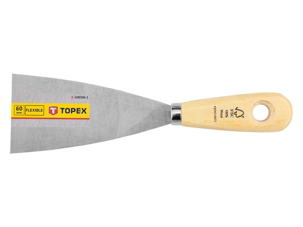 Malířská špachtle 60 mm 18B306-1 od společnosti TOPEX je nástroj, který se vyznačuje šířkou 60 mm. Je vybaven praktickou dřevěnou rukojetí. Tmel TOPEX se osvědčí při mnoha úkolech.