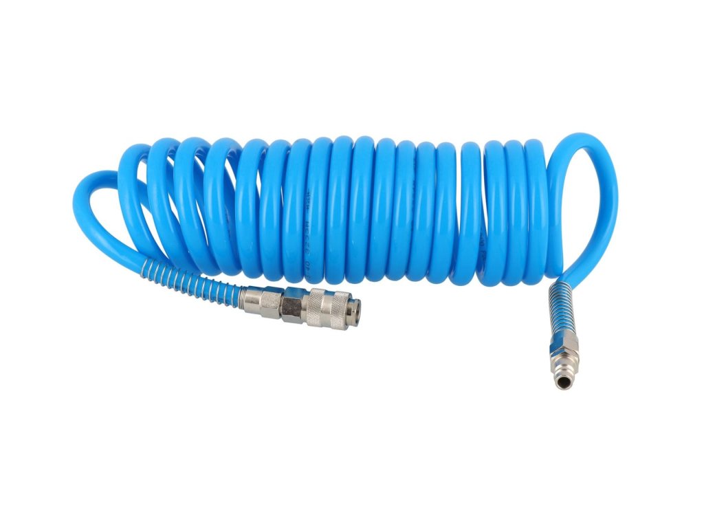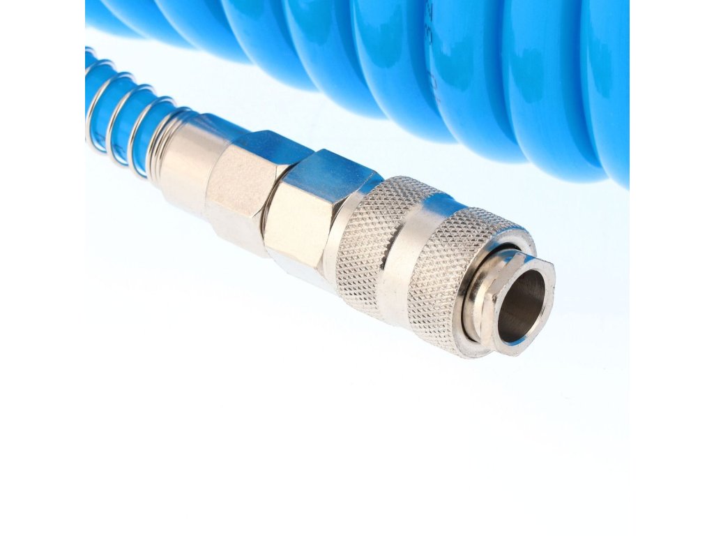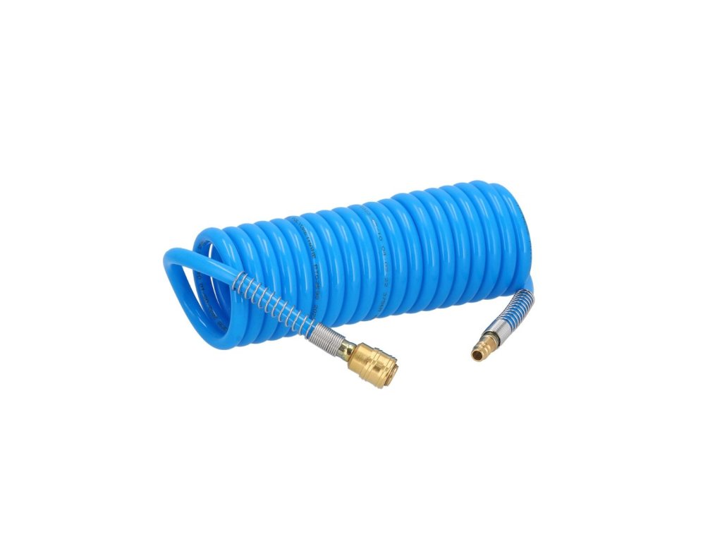 Spirální pneumatická hadice PU s vybavením 5 m fi 12 x 8 mm Vysoce kvalitní spirální pneumatická hadice o délce 5 metrů a průměru 12 x 8 mm, vyrobená z odolného polyuretanu (PU)
