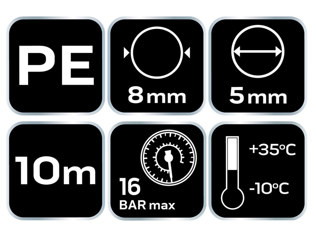 Spirálová tlaková hadice 5 x 8 mm, 10 m, PE 14-804-1 značky NEO TOOLS je hadice o průměru 5 x 8 mm a délce 10 metrů. Je vyrobena z PE (polyethylenu), materiálu s vysokou odolností vůči tlaku - až do 16 barů. Nabízí se s koncovkami (přípojkami). Má rozsah pracovních teplot od -10 °C do +35 °C. Vhodný jako přívodní vedení stlačeného vzduchu. z kompresoru k pneumatickému nářadí (pneumatické klíče, brusky atd.) a jako vedení od kompresoru k foukacím pistolím. Má možnost připojení různých přístrojů. čerpacího hrotu s manometrem. Spirálová tlaková hadice NEO TOOLS se doporučuje pro úkoly v automobilovém průmyslu, v průmyslu a pro kutily.