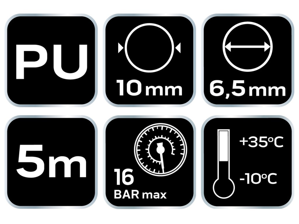 Spirálová tlaková hadice 6,5 x 10 mm, 5 m, PU 12-070-1 od společnosti NEO TOOLS je hadice o průměru 6,5 x 10 mm a délce 5m. Je vyrobena z PU (polyuretanu), materiálu s vysokou odolností vůči tlaku – až do 16 barů. Nabízí se s koncovkami (přípojkami). Má pracovní rozsah od -10 °C do +35 °C. Vhodný jako přívodní vedení stlačeného vzduchu. od kompresoru k pneumatickému nářadí (pneumatické klíče, brusky atd.) a jako vedení od kompresoru k foukacím pistolím. Má možnost připojení různých přístrojů. čerpacího hrotu s manometrem. Spirálová tlaková hadice NEO TOOLS se doporučuje pro úkoly v automobilovém průmyslu, v průmyslu a pro kutily.