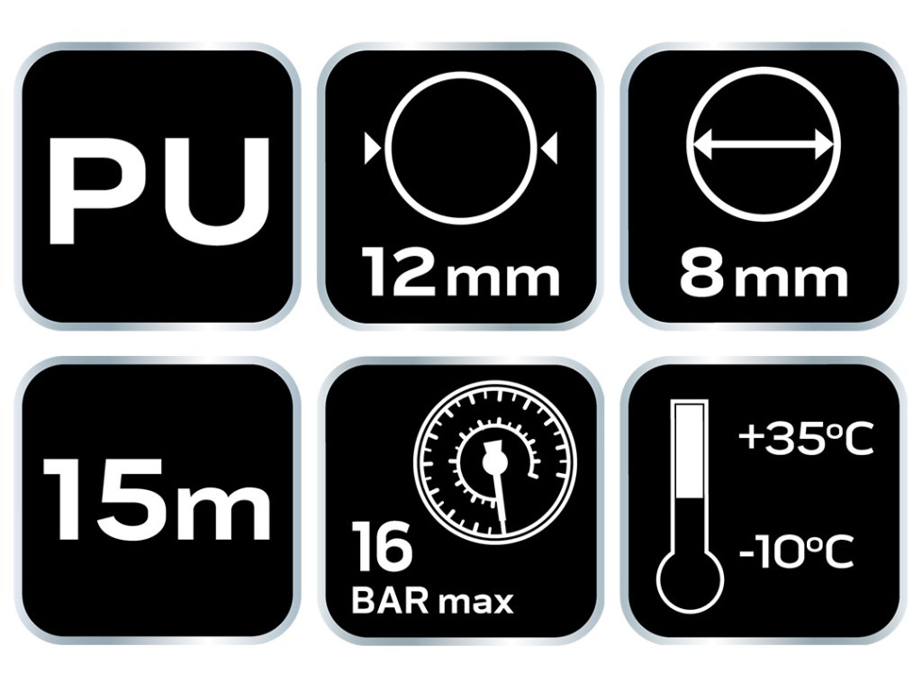 Spirálová tlaková hadice 8 x 12 mm, 15 m, PU 12-076-1 od společnosti NEO TOOLS je hadice o průměru 8 x 12 mm a délce 15m. Je vyrobena z PU (polyuretanu), materiálu s vysokou odolností vůči tlaku – až do 16 barů. Nabízí se s koncovkami (přípojkami). Má pracovní rozsah od -10 °C do +35 °C. Vhodný jako přívodní vedení stlačeného vzduchu. od kompresoru k pneumatickému nářadí (pneumatické klíče, brusky atd.) a jako vedení od kompresoru k foukacím pistolím. Má možnost připojení různých přístrojů. čerpacího hrotu s manometrem. Spirálová tlaková hadice NEO TOOLS se doporučuje pro úkoly v automobilovém průmyslu, v průmyslu a pro kutily.