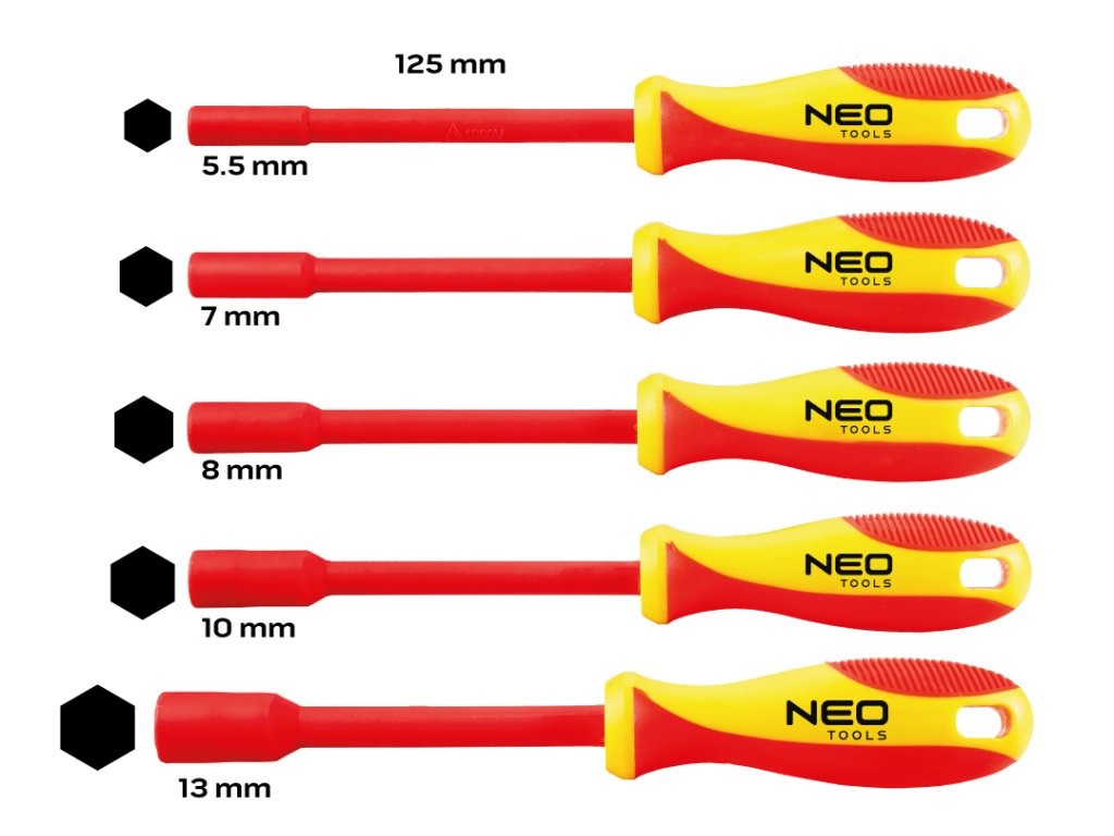 Izolované nástrčné šroubováky 5 ks. 04-145 od NEO TOOLS je jedinečná sada určená pro utahování šroubů pod napětím, která se skládá z 5 kusů izolovaných nástrčných šroubováků. Nabízené nářadí je ve velikostech: 5,5; 7; 8; 10; 13 mm, každý o délce 125 mm. Šroubováky NEO TOOLS se budou dobře hodit do výbavy elektrikářů.