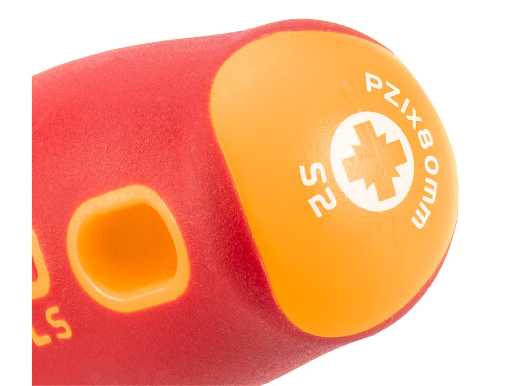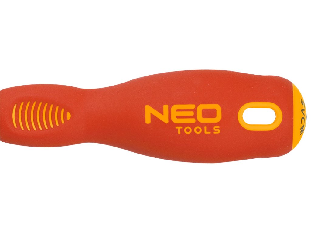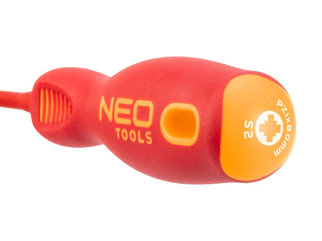 Křížový šroubovák NEO 1000 V (ref. 04-072) o rozměrech PH1 x 80 mm. Schválen pro práci pod napětím do 1000 V. Čepel šroubováku je vyrobena z odolné oceli S2. Pracovní hrot čepele byl tepelně upraven, čehož výsledkem je tvrdost a odolnost proti ohybu 56 HRC. Šroubovák má magnetický hrot. Trojúhelníkový tvar rukojeti s tvarovanou opěrkou pro palec snižuje namáhání ruky při práci a usnadňuje dosažení optimálního točivého momentu. Rukojeť ze dvou materiálů zabraňuje klouzání v ruce a je odolná vůči chemikáliím, olejům a tukům. Kvalitu nářadí potvrzuje certifikát TÜV a 25letá záruka výrobce. Značka NEO splňuje očekávání profesionálů. ocel