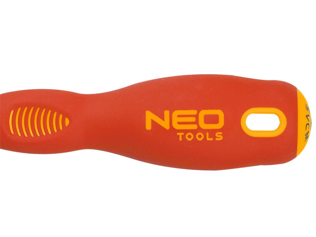 Plochý šroubovák NEO 1000V (ref. 04-054) o rozměrech 5,5 x 125 mm. Schválen pro práci pod napětím do 1000 V. Čepel šroubováku je vyrobena z mimořádně pevné oceli S2. Pracovní hrot čepele byl tepelně upraven, což má za následek vhodnou tvrdost a odolnost vůči ohybu. Šroubovák má magnetický hrot. Trojúhelníkový tvar rukojeti s tvarovanou opěrkou pro palec snižuje namáhání ruky při práci a usnadňuje dosažení optimálního točivého momentu. Rukojeť ze dvou materiálů zabraňuje klouzání v ruce a je odolná vůči chemikáliím, olejům a tukům. Kvalitu nářadí potvrzuje certifikát TÜV a 25letá záruka výrobce. Značka NEO splňuje očekávání profesionálů.