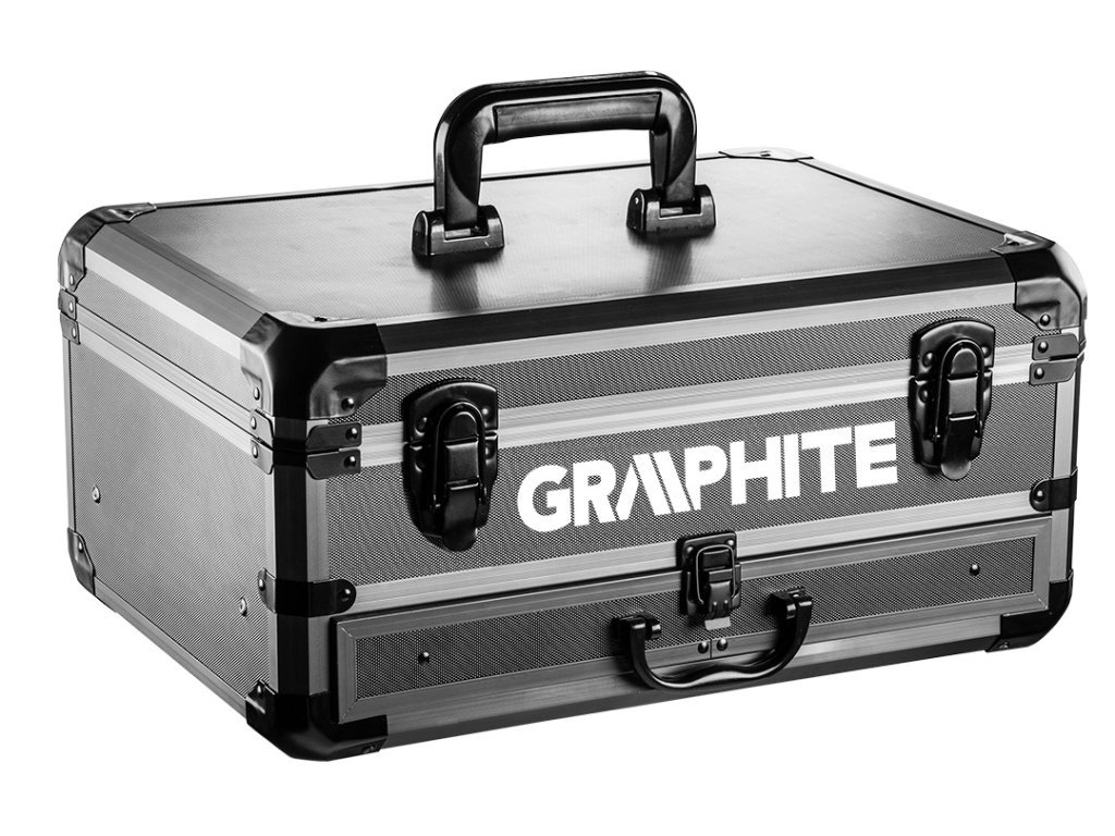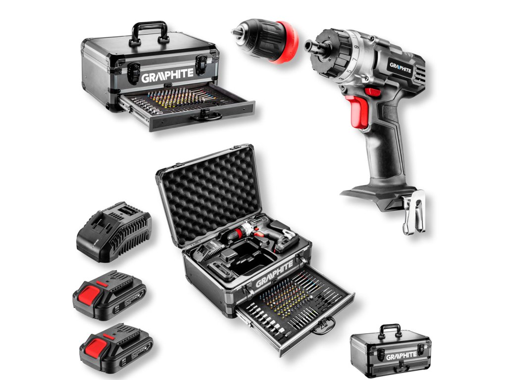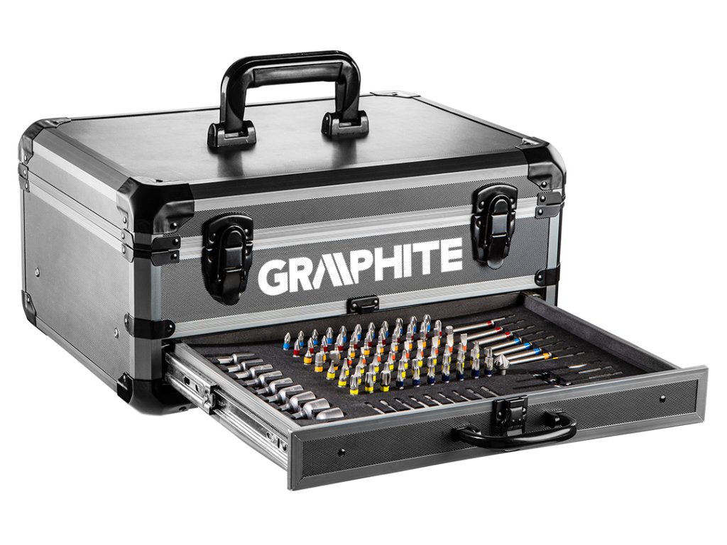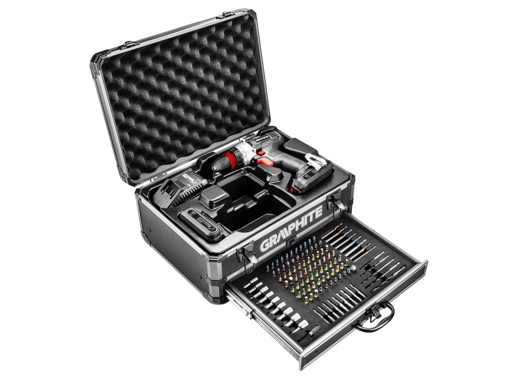 Souprava GRAPHITE Energy+. Součástí soupravy jsou: vrtací šroubovák, dva akumulátory 2,0 Ah (58G002), nabíječka (58G001) a 109 ks příslušenství v podobě nástavců a vrtáků. Celá souprava se nachází ve funkčním a odolném hliníkovém kufříku. Kufřík je vybaven výlisky s navrženým místem pro každý prvek soupravy. V hlavní přihrádce kufříku se nachází také prostor pro další příslušenství uživatele. Bity, které jsou součástí vybavení, byly vyrobeny z oceli S2 s vysokou tvrdostí. Souprava je ideálním řešením pro každou osobu, která si cení snadného skladování a přepravy svých oblíbených nástrojů rizika jejich poškození vnějšími činiteli.