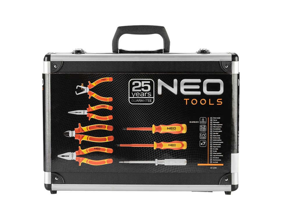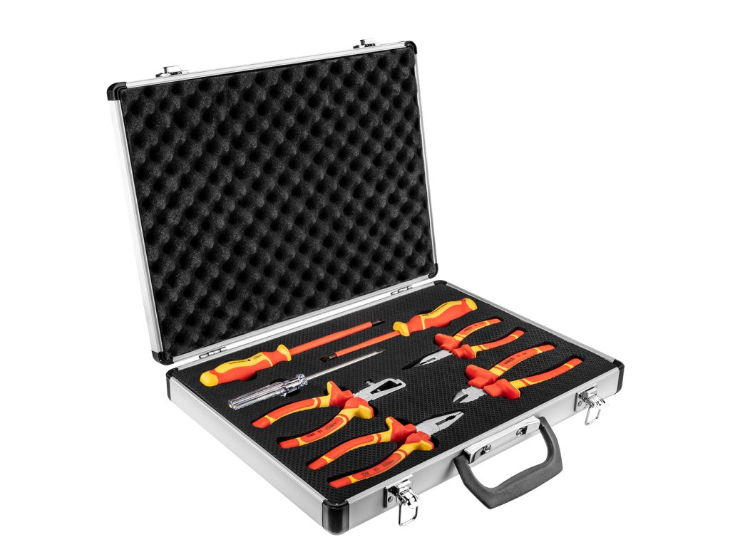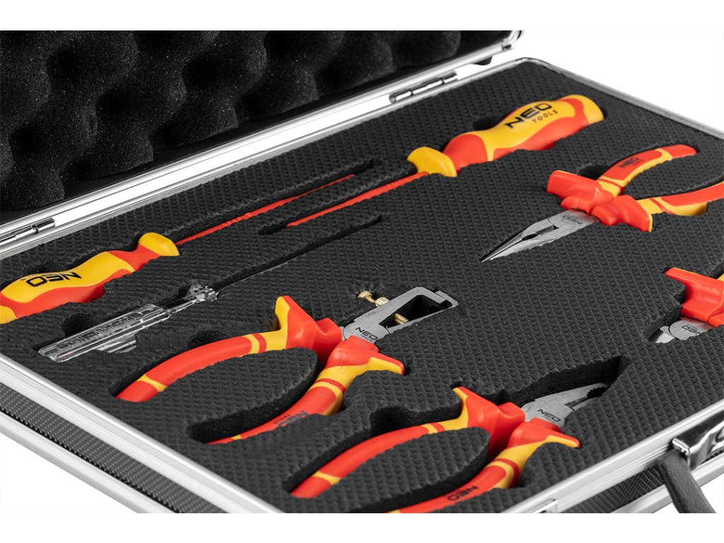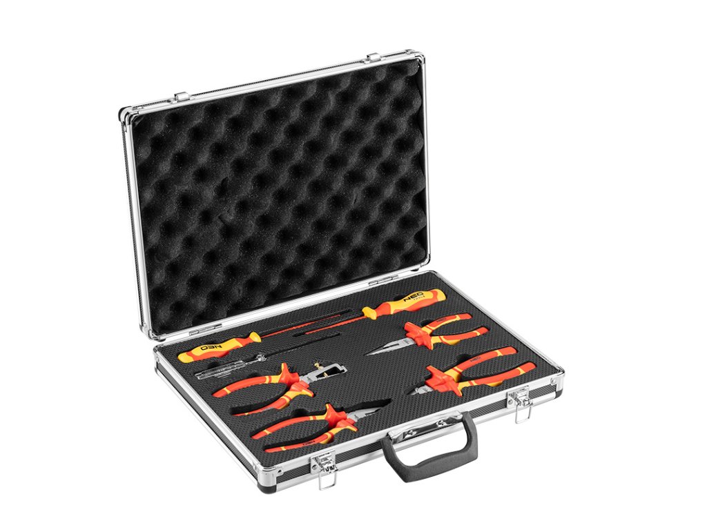 Sada šroubováků a kleští je určena pro elektrikáře, díky své kvalitní izolaci. Souprava obsahuje 4 ks kleští 2ks šroubováků a jednu zkoušečku napětí. Souprava je uložena v praktickém kufříku pro pohodlné skladování a přenášení. Kleště jsou vyrobeny z kované chrom-vanadiové oceli. Řezné hrany jsou přesně opracované, odolné a účinné. Šroubováky mají čepele z extrémně odolné chrom-molybdenové oceli. Ergonomické rukojeti ze dvou materiálů zvyšují komfort práce a poskytuje dostatečnou izolaci. Součástí balení je také zkoušečka napětí.