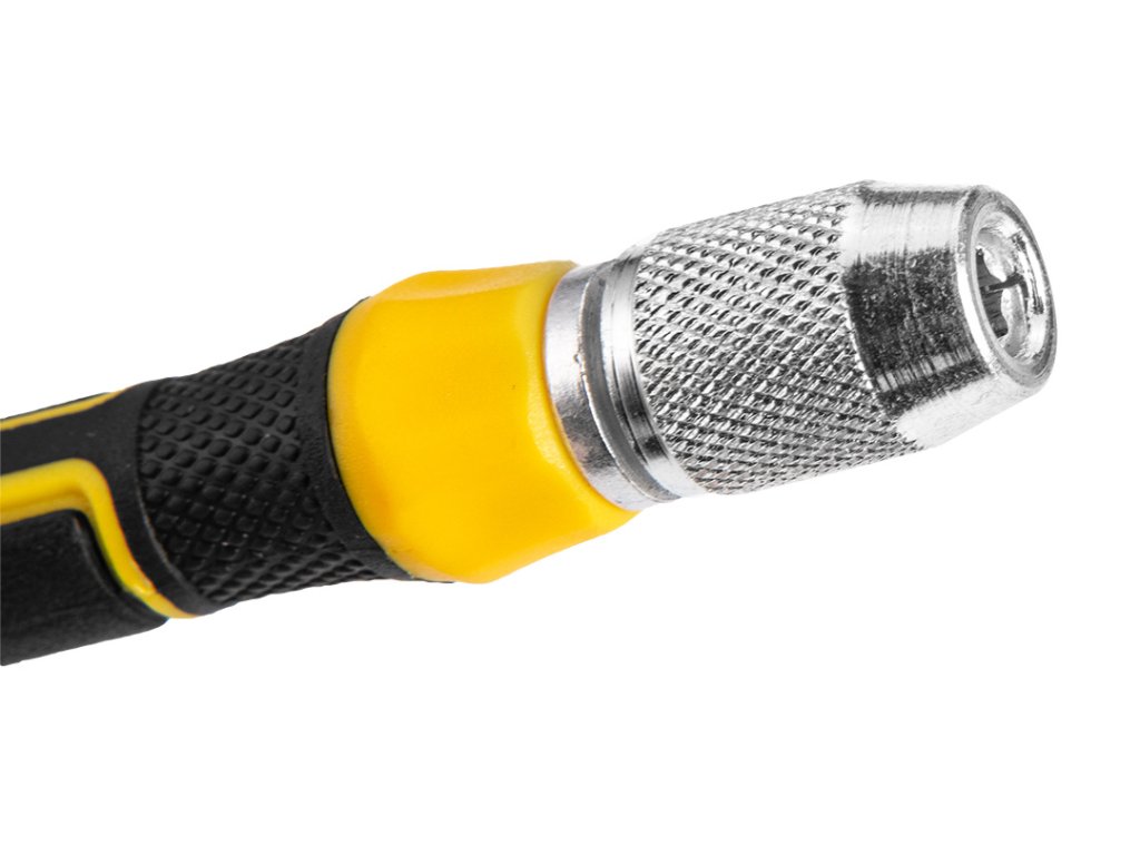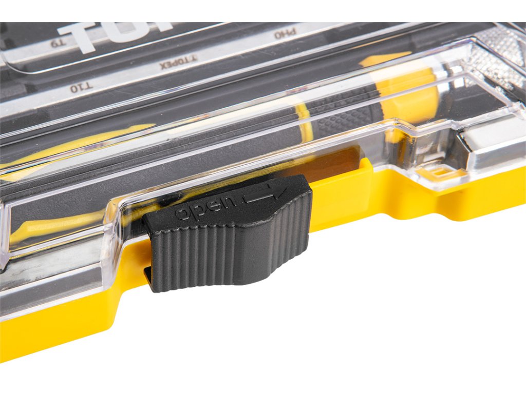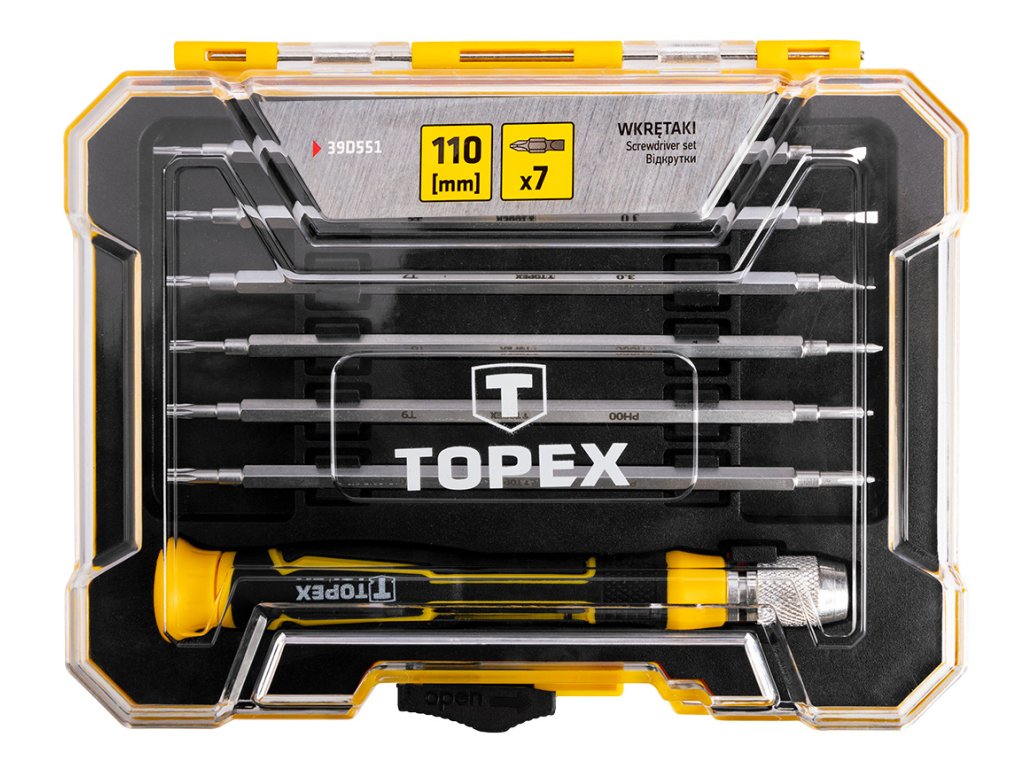 Sada přesných šroubováků TOPEX (ref. 39D551) obsahuje 6 oboustranných čepelí, tzn. j. 12 bitů. Vyrobeno z kvalitní chrom-vanadiové oceli, která zaručuje dlouhou životnost nástrojů. Ergonomická plastová rukojeť poskytuje pohodlí při práci. Praktický plastový obal pro snadné skladování. Značka TOPEX je určena pro domácí kutily.