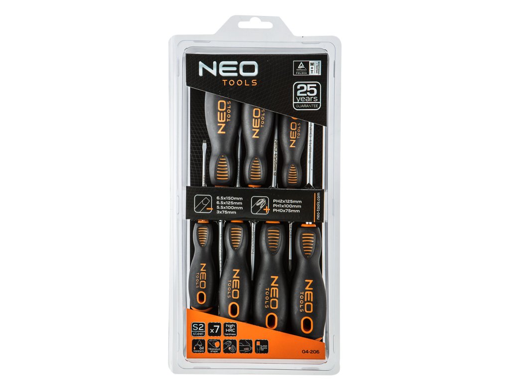 Sada šroubováků NEO (ref. č. 04-206) obsahuje 7 šroubováků: ploché a křížové. Hrot šroubováku je zhotoven z mimořádně odolné oceli S2. Pracovní nástavec hrotu byl tepelně opracován, díky čemuž získal přiměřenou tvrdost a odolnost vůči ohnutí. Šroubovák má magnetický nástavec. Tříhranný tvar držáku s vyprofilovanou oporou pro palec snižuje zatížení rukou při práci a usnadňuje dosažení optimálního momentu otáčení. Držák ze dvou materiálů zabraňuje klouzání v ruce, je odolný vůči působení chemikálií, olejů a maziv. Kvalita nástroje je potvrzena 25letou zárukou výrobce. Značka NEO splňuje očekávání profesionálů.