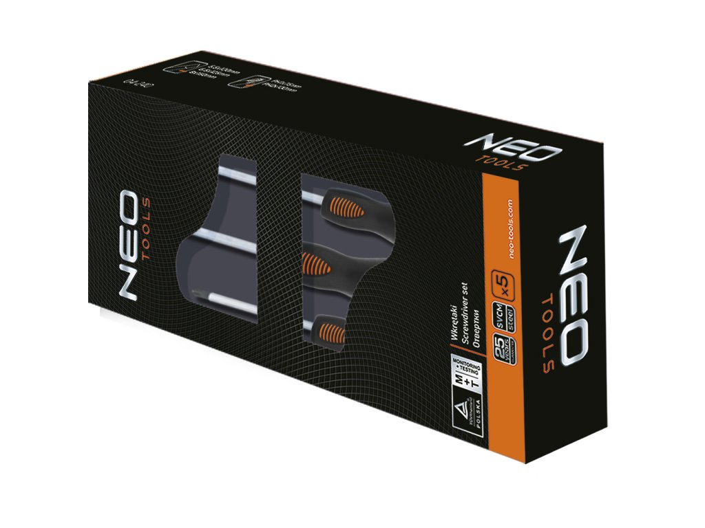 Sada šroubováků NEO beat (ref. 04-240) obsahuje 5 šroubováků: plochý a křížový. Čepel šroubováku je vyrobena z mimořádně odolné oceli S2. Pracovní hrot čepele byl tepelně zpracován, díky čemuž bylo dosaženo vhodné tvrdosti a odolnosti proti ohybu 56 HRC. Šroubovák má magnetický hrot a bitou rukojeť. Trojúhelníkový tvar rukojeti s tvarovanou opěrkou pro palec snižuje zatížení ruky během práce a usnadňuje dosažení optimálního točivého momentu. Rukojeť z dvojitého materiálu zabraňuje sklouznutí v ruce a je odolná vůči chemikáliím, olejům a tukům. Kvalitu nástroje potvrzuje certifikát TÜV a 25letá záruka výrobce. Značka NEO splňuje očekávání profesionálů.