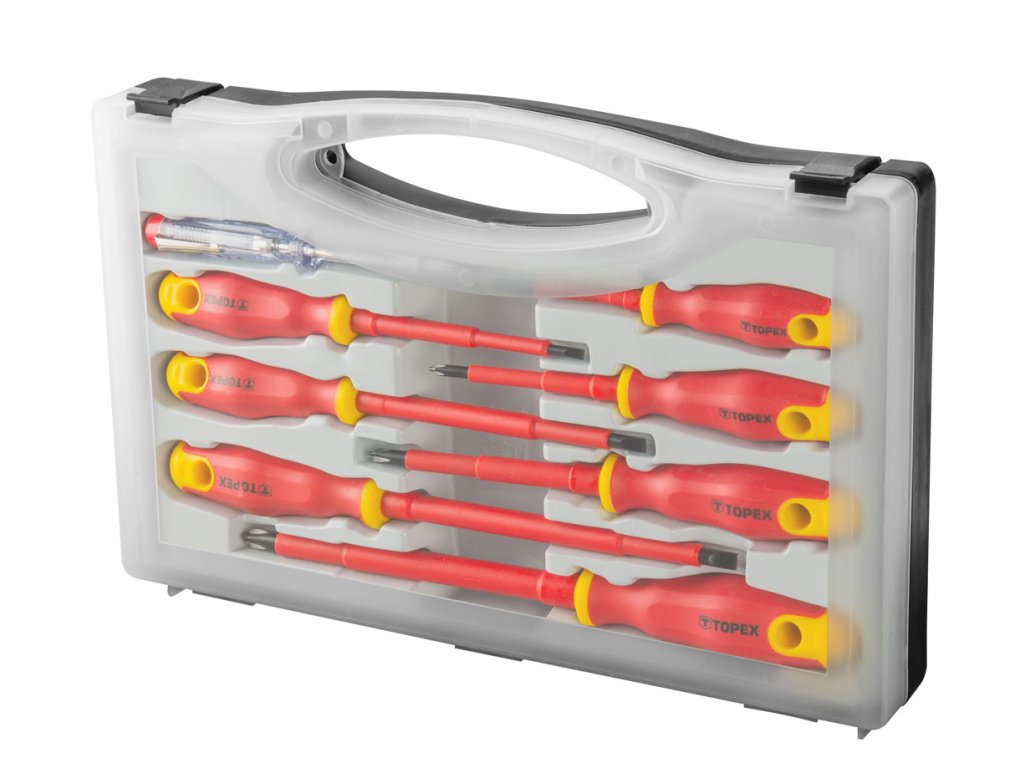 Sada šroubováků 1000V TOPEX (ref. 39D674) určená pro práci s napětím do 1000 V. Každý ze sedmi šroubováků je vyroben z kvalitní chrom-vanadiové oceli, izolovaný. Kromě toho souprava obsahuje elektrickou zkoušečku 125 - 250 V. Ergonomická plastová rukojeť pokrytá protiskluzovým materiálem poskytuje pohodlí a bezpečnost při práci. Značka TOPEX je určena pro domácí kutily.