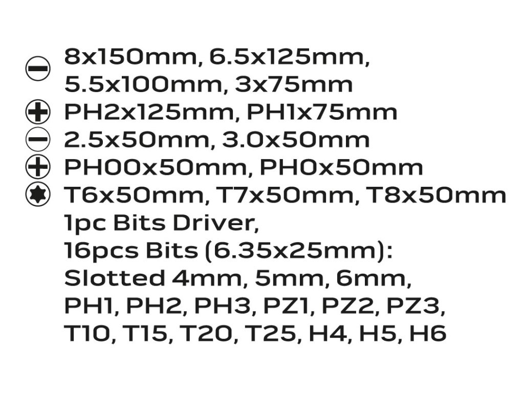 Sada šroubováků a šroubovacích nástavců NEO (ref. č. 04-209) obsahuje 30 vysoce kvalitních součástek. Hrot každého šroubováku je zhotoven z mimořádně odolné oceli S2 zaručující dlouhou životnost. Šroubováky mají magnetickou koncovku. Tříhranný tvar držáku s vyprofilovanou oporou pro palec snižuje zatížení rukou při práci a usnadňuje získání optimálního momentu otáčení. Držák ze dvou materiálů zabraňuje klouzání v ruce, je odolný vůči působení chemikálií, olejů a maziv. Kvalita nástroje je potvrzena 25letou zárukou výrobce. Toto vše, spolu s 8 precizními šroubováky nejvyšší kvality a 16 bity různých tvarů a velikostí, umístěných v příručním kufříku usnadňujícím přepravu a uchovávání. Značka NEO splňuje očekávání profesionálů.
