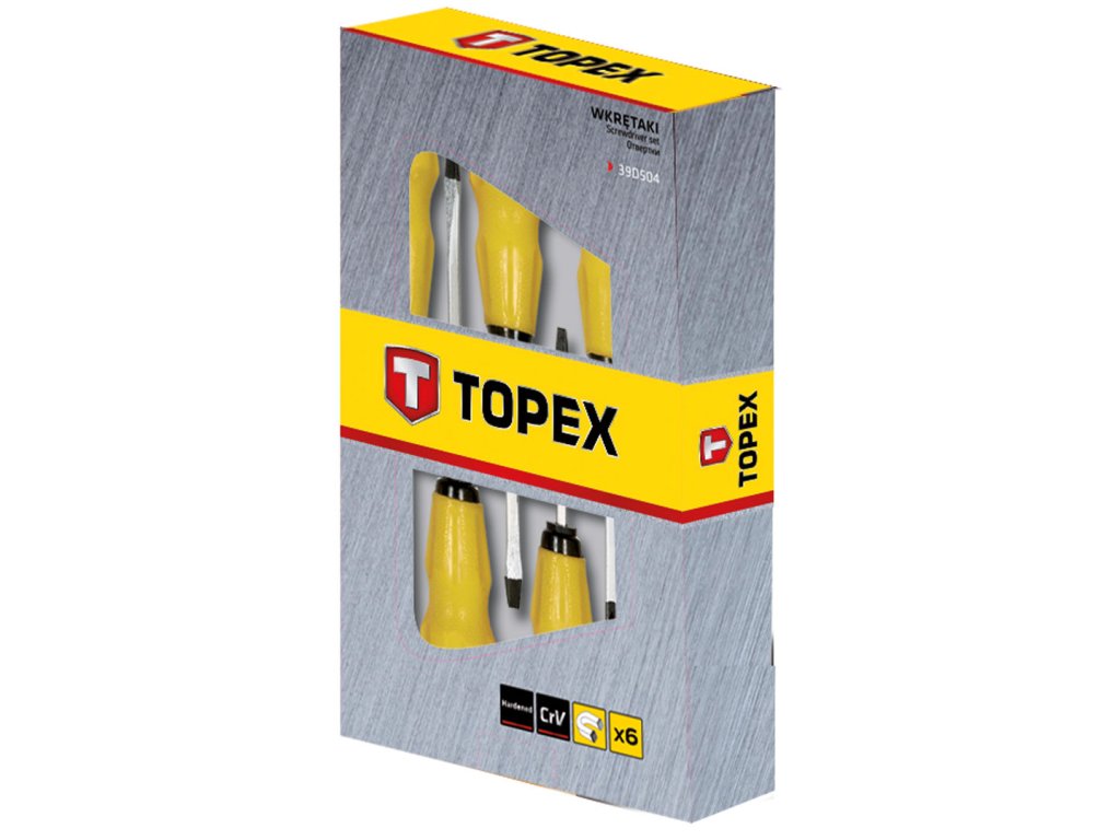 Sada podbíjecích šroubováků TOPEX (ref. 39D504) určená k utahování a povolování zajištěných, dotažených šroubů. Čepel každého ze šesti šroubováků je vyrobena z odolné chrom-vanadiové oceli, což zaručuje dlouhou životnost nářadí. Magnetický hrot z kalené oceli usnadňuje používání nástroje. Ergonomická plastová rukojeť dobře padne do ruky, což zvyšuje pohodlí při práci. Značka TOPEX je určena pro domácí kutily.