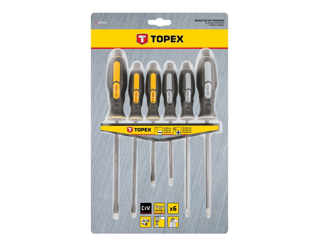 Sada podbíjecích šroubováků TOPEX (ref. 39D506) určená k utahování a povolování zajištěných, dotažených šroubů. Čepel každého ze šesti šroubováků je vyrobena z odolné chrom-vanadiové oceli, což zaručuje dlouhou životnost nářadí. Magnetický hrot z kalené oceli usnadňuje používání nástroje. Ergonomická plastová rukojeť dobře padne do ruky, což zvyšuje pohodlí při práci. Umístěno na plastovém ramínku pro snadné skladování. Značka TOPEX je určena pro domácí kutily.