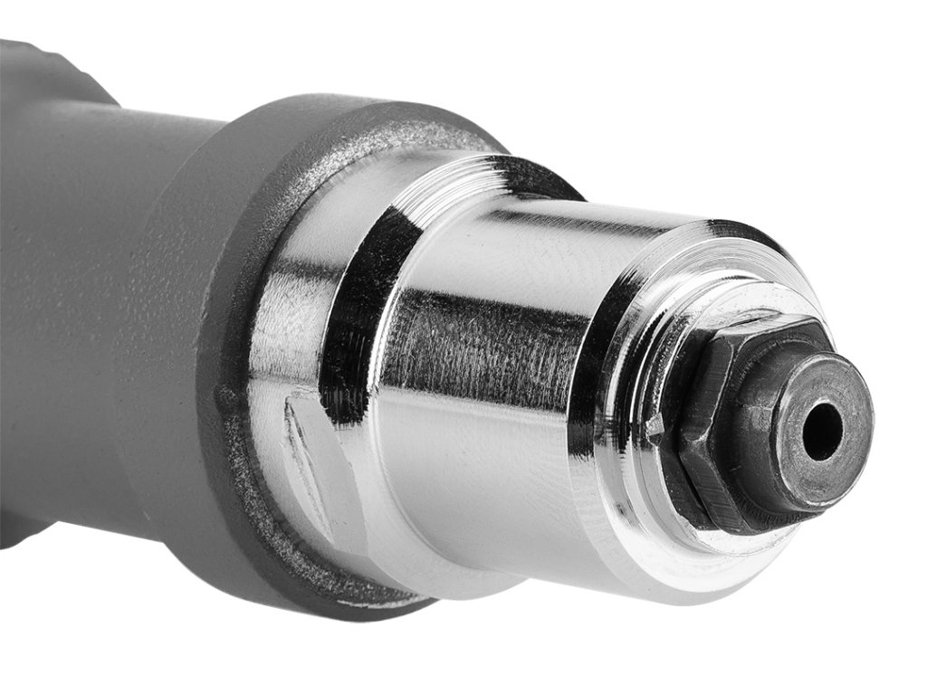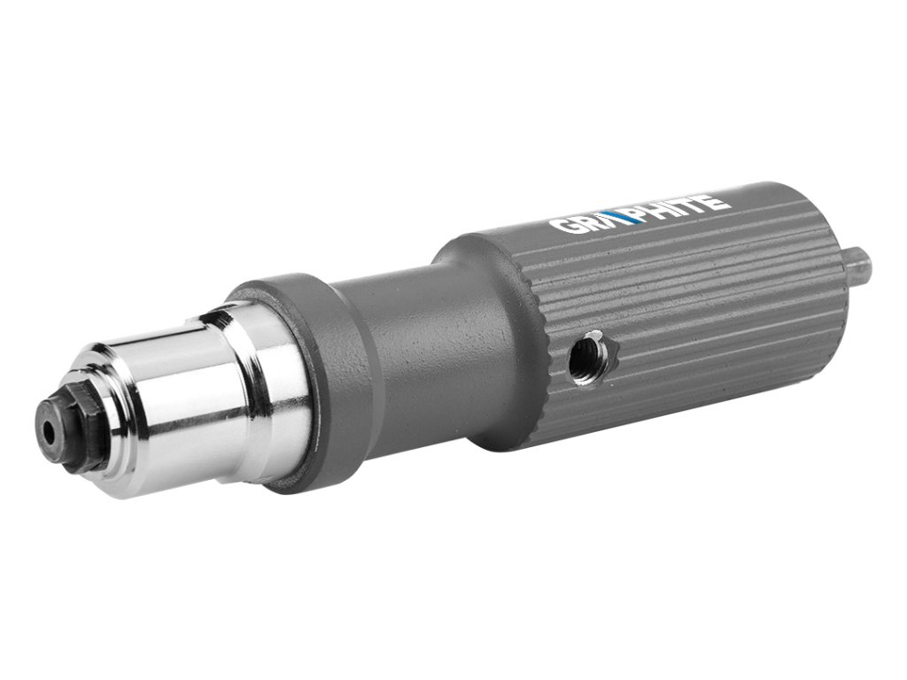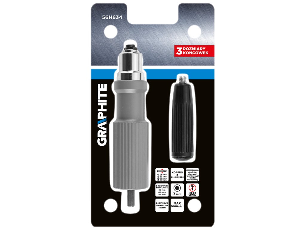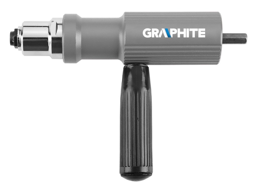 Šroubovací nýtovací adaptér 56H634 od společnosti GRAPHITE je adaptér se 3 velikostmi konců pro montáž ocelových a hliníkových nýtů o průměru: 2,4; 3,2; 4; 4,8 mm. Nabízí se v sadě s oboustranným klíčem pro jejich výměnu, jakož i - sadou přídavných čelistí, které jsou umístěny v rukojeti. Tělo adaptéru značky GRAPHITE je vyrobeno z lehkého hliníku, hlava je z robustní oceli a rukojeť je vyrobena z plastu. Adaptér má délku 156 mm a výšku 111 mm. Jeho instalace na šroubovák je mimořádně jednoduchá a odebírání nýtů je bez námahy. Chcete-li nýt slisovat, zapnete pravou rychlost (stejnou jako při šroubování), chcete-li vysunout zbývající stopku nýtu, zapnete levou rychlost a výrobek odšroubujete. V dalším kroku můžete utáhnout další nýt. Výrobek je vhodný pro profesionály i amatéry.