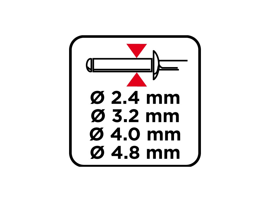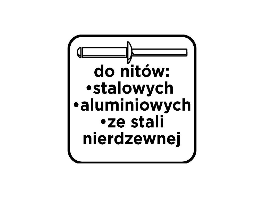 Adaptér pro nýtování na šroubovák. 3 velikosti bitů pro montáž ocelových a hliníkových nýtů o průměrech: 2,4; 3,2; 4; 4,8 mm. Délka adaptéru 156 mm, výška 111 mm.
