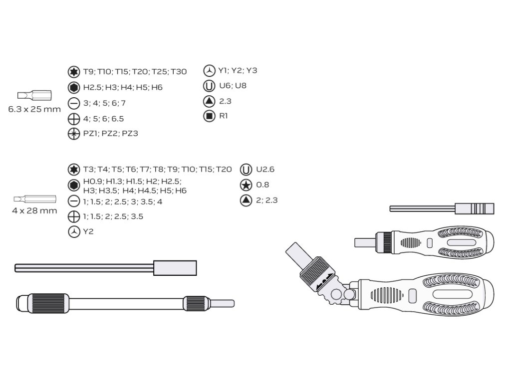 Šroubovací nástavce se sklíčidlem 73 ks (ref. č. 06-115) ocel CrV, bity SL?3.0 4.0 5.0 6.0 7.0, PH?4.0 5.0 6.0 6.5, TORX?T9 T10 T10 T10 H3.0 H4.0 H5.0 H6.0, Y?Y1 Y2 Y3, U6 U8, Trangle?2.3 SQ?SQ?R1 PZ?Pz1 Pz2 Pz3, precizní bity TORX?T3 T4 T5 T6 T7 T8 T9 T10 T15 T20, HEX?0.0. 3.0 3.5 4.0 4.5 5.0 6.0, SL?1.0 1.5 2.0 2.5 3.0 3.5 4.0, PH?1.0 1.5 2.0 2.5 3.5, Trojúhelník?2.0 2.3 Hvězda2.0 Hvězda2.0 130mm, tvrdé prodlužovačky?100mm, 115mm