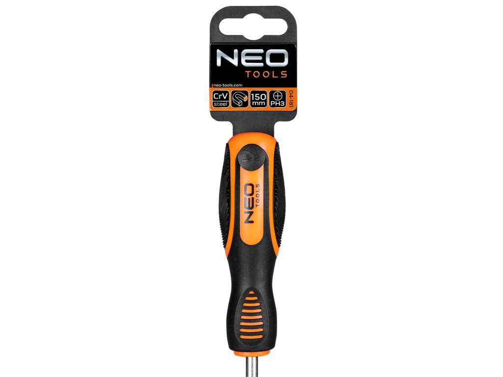 Křížový šroubovák NEO (ref. 04-181) užitečný při mechanických pracích a kutilství. Čepel o délce 150 mm je vyrobena z odolné chrom-vanadiové oceli, což zaručuje dlouhou životnost nástroje. Magnetický hrot z tvrzené oceli PH3 usnadňuje používání nástroje. Ergonomická plastová rukojeť pokrytá protiskluzovým materiálem zajišťuje bezpečnost a pohodlí při práci. Značka NEO splňuje očekávání profesionálů.
