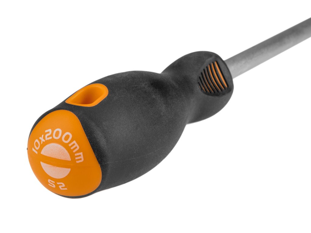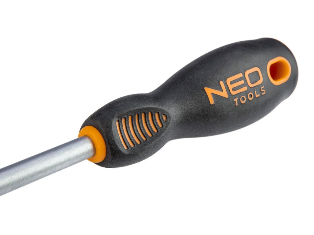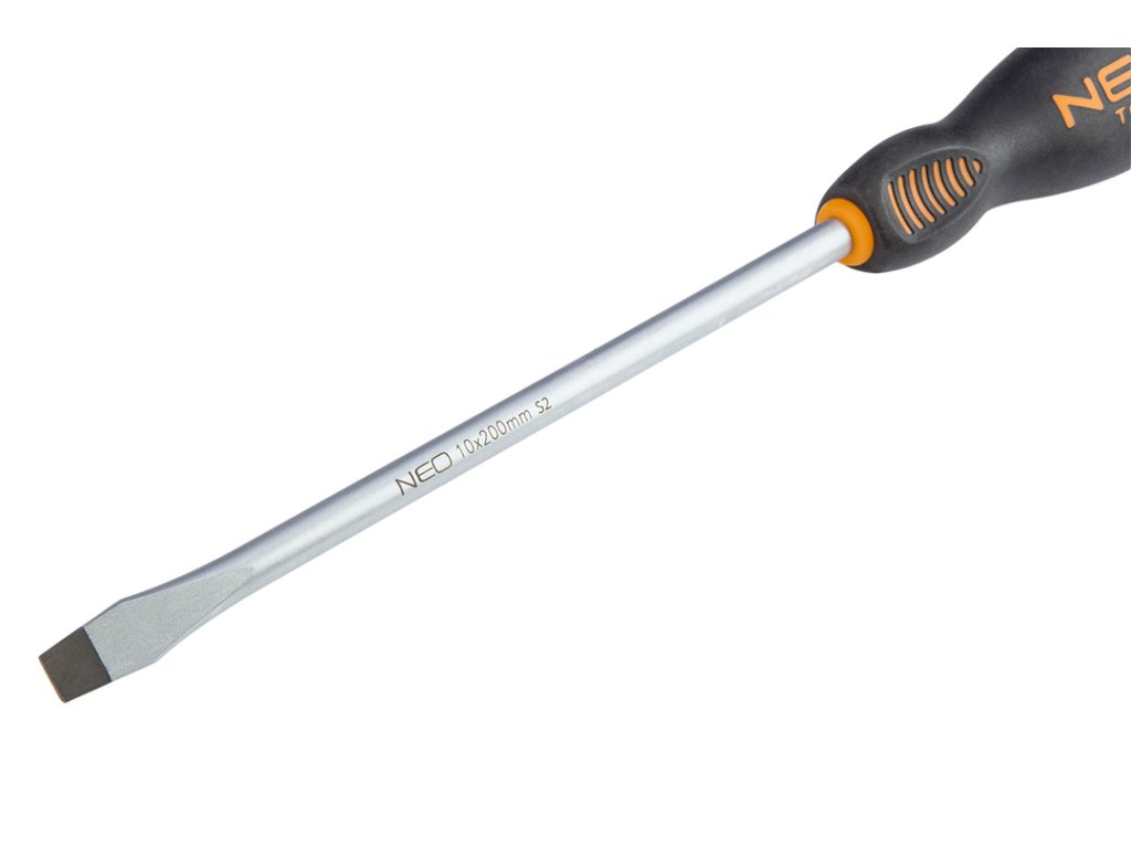 Plochý šroubovák NEO (ref. 04-004) o rozměrech 10,0 x 200 mm. Čepel šroubováku je vyrobena z mimořádně odolné oceli S2. Pracovní konec čepele byl tepelně zpracován, díky čemuž bylo dosaženo vhodné tvrdosti a odolnosti proti ohybu 56 HRC. Šroubovák má magnetický hrot. Trojúhelníkový tvar rukojeti s profilovanou opěrkou palce snižuje zatížení ruky během práce a usnadňuje dosažení optimálního točivého momentu. Rukojeť ze dvou materiálů zabraňuje klouzání v ruce a je odolná vůči chemikáliím, olejům a tukům. Kvalitu nástroje potvrzuje certifikát TÜV a 25letá záruka výrobce. Značka NEO splňuje očekávání profesionálů.