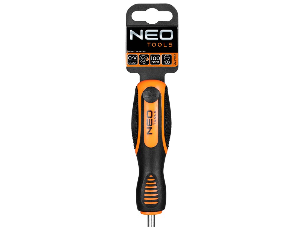 Plochý šroubovák NEO (ref. 04-172) 4 x 100 mm. Čepel je vyrobena z odolné chrom-vanadiové oceli, což zaručuje dlouhou životnost nástroje. Magnetický hrot z kalené oceli usnadňuje práci s nástrojem. Ergonomická plastová rukojeť pokrytá protiskluzovým materiálem zajišťuje bezpečnost a pohodlí při práci. Značka NEO splňuje očekávání profesionálů