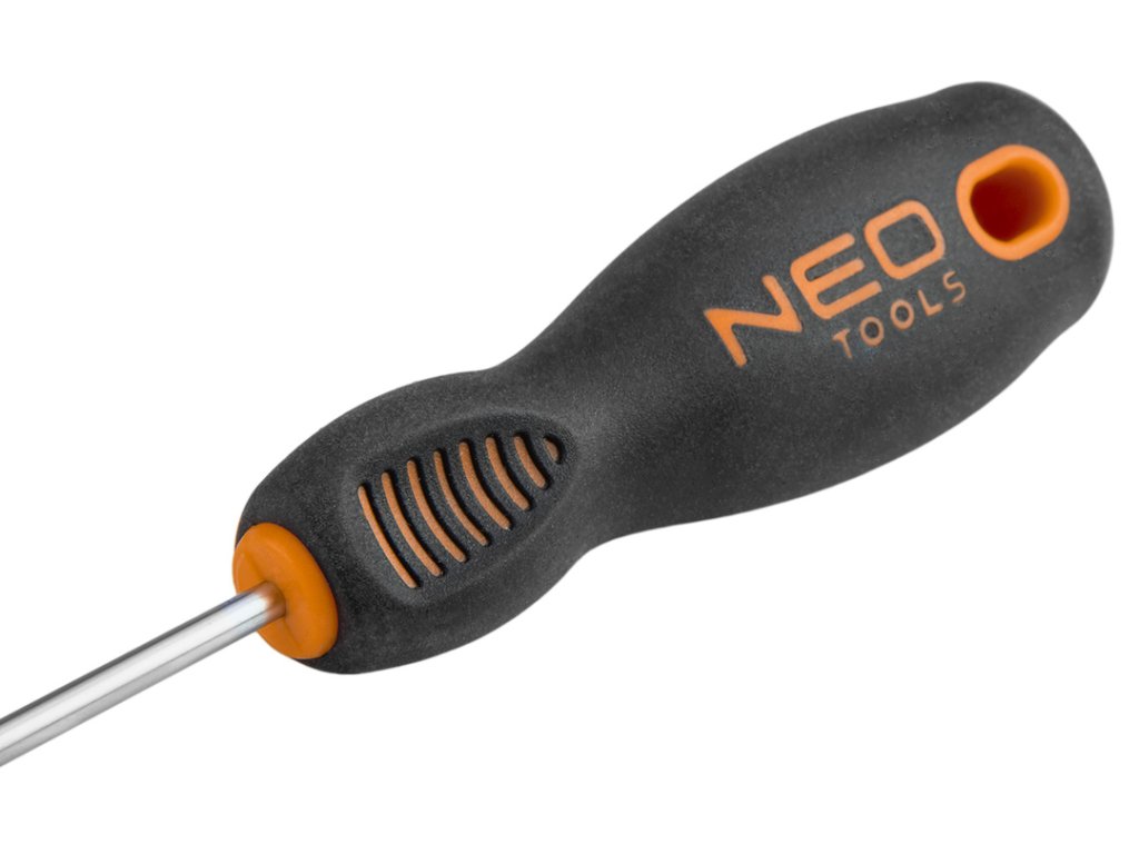 Plochý šroubovák NEO (ref. 04-012) o rozměrech 4,0 x 100 mm. Čepel šroubováku je vyrobena z mimořádně odolné oceli S2. Pracovní hrot šroubováku byl tepelně zpracován, díky čemuž bylo dosaženo vhodné tvrdosti a odolnosti proti ohybu 56 HRC. Šroubovák má magnetický hrot. Trojúhelníkový tvar rukojeti s profilovanou opěrkou palce snižuje zatížení ruky během práce a usnadňuje dosažení optimálního točivého momentu. Rukojeť ze dvou materiálů zabraňuje klouzání v ruce a je odolná vůči chemikáliím, olejům a tukům. Kvalitu nástroje potvrzuje certifikát TÜV a 25letá záruka výrobce. Značka NEO splňuje očekávání profesionálů.