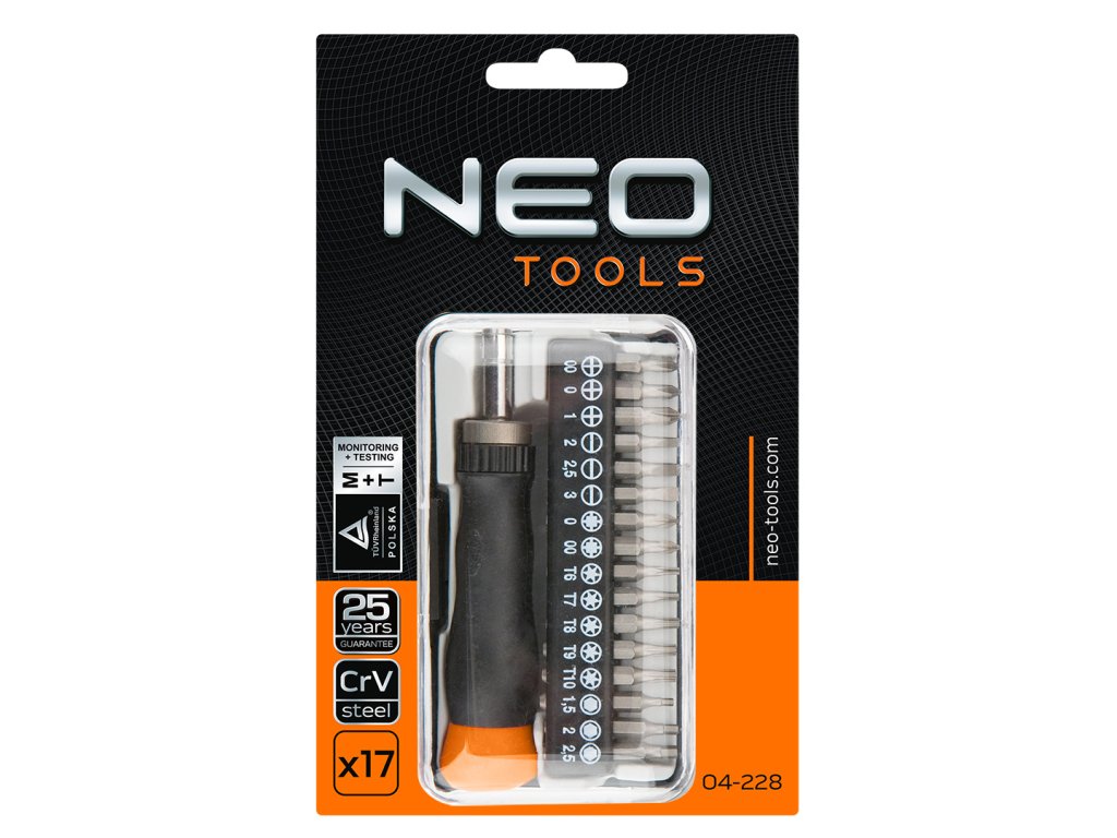 Sada přesných šroubováků NEO (ref. 04-228) obsahuje rukojeť a 16 šroubovacích bitů 30 mm (ploché, křížové, Torx a šestihranné). Magnetické bity jsou vyrobeny z mimořádně odolné chrom-molybdenové oceli. Otočná objímka v rukojeti umožňuje přesné dotažení šroubů. Rukojeť ze dvou materiálů je odolná vůči chemikáliím, olejům a tukům. Celá souprava je zabalena v praktickém kufříku. Certifikát TÜV Rheinland je zárukou vysoké kvality a spolehlivosti výrobku. Značka NEO splňuje očekávání profesionálů.