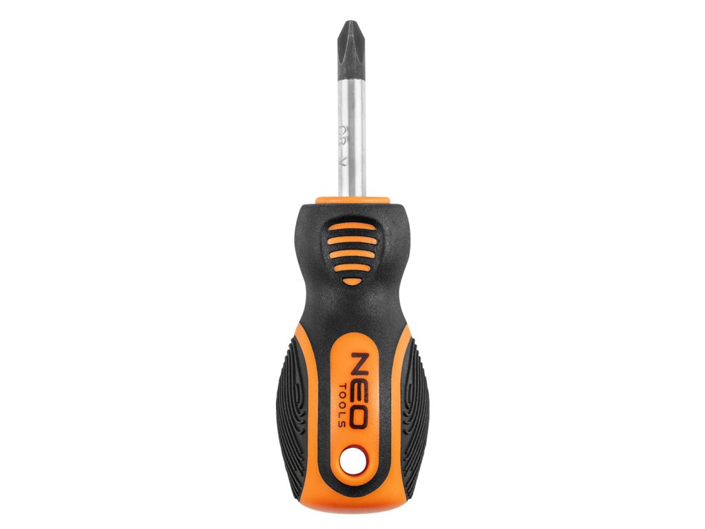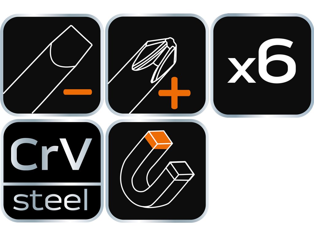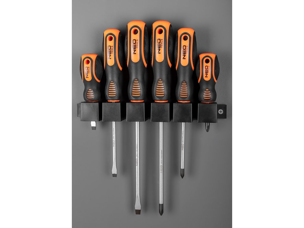 Sada šroubováků NEO (ref. 04-193) obsahuje 6 šroubováků: plochých a křížových. Čepel šroubováku je vyrobena z odolné CrV oceli. Šroubovák má magnetický hrot. Trojúhelníkový tvar rukojeti s profilovanou opěrkou palce snižuje zatížení ruky během práce a usnadňuje dosažení optimálního točivého momentu. Rukojeť ze dvou materiálů zabraňuje klouzání v ruce a je odolná vůči chemikáliím, olejům a tukům. to NEO brand meets the expectations of professionals.