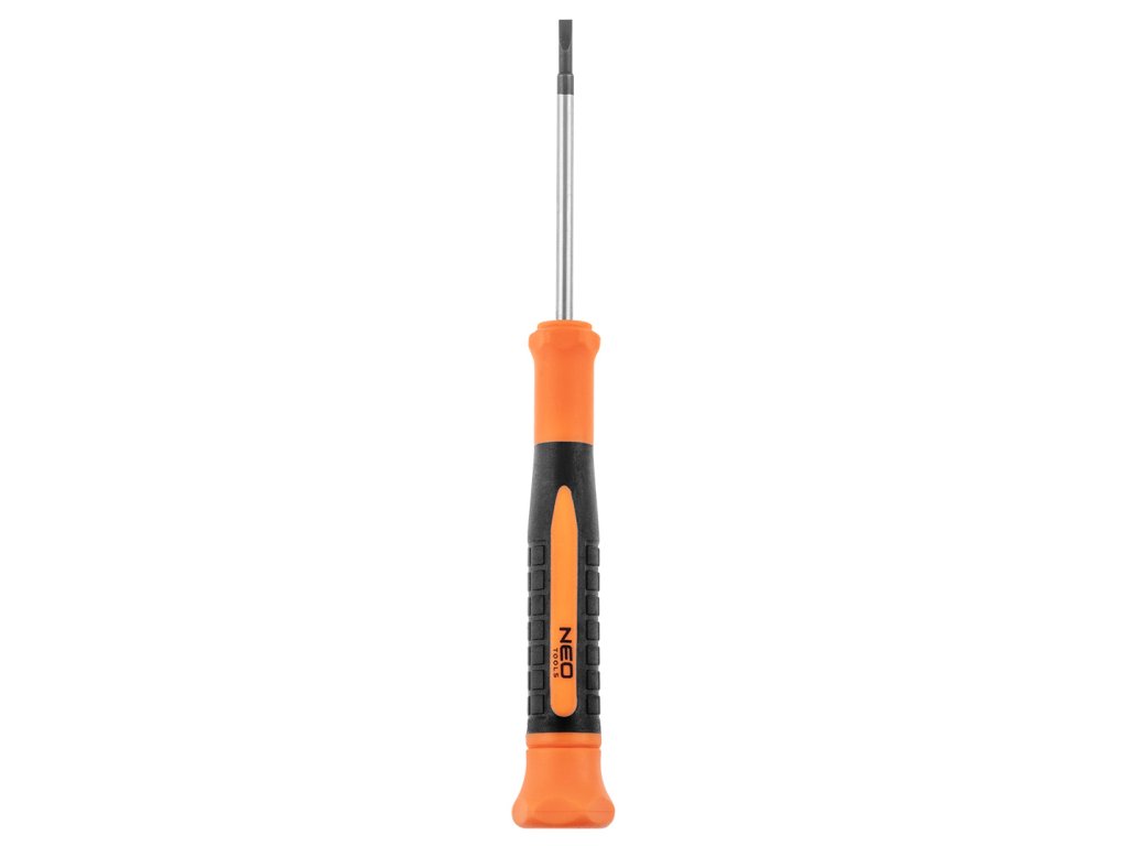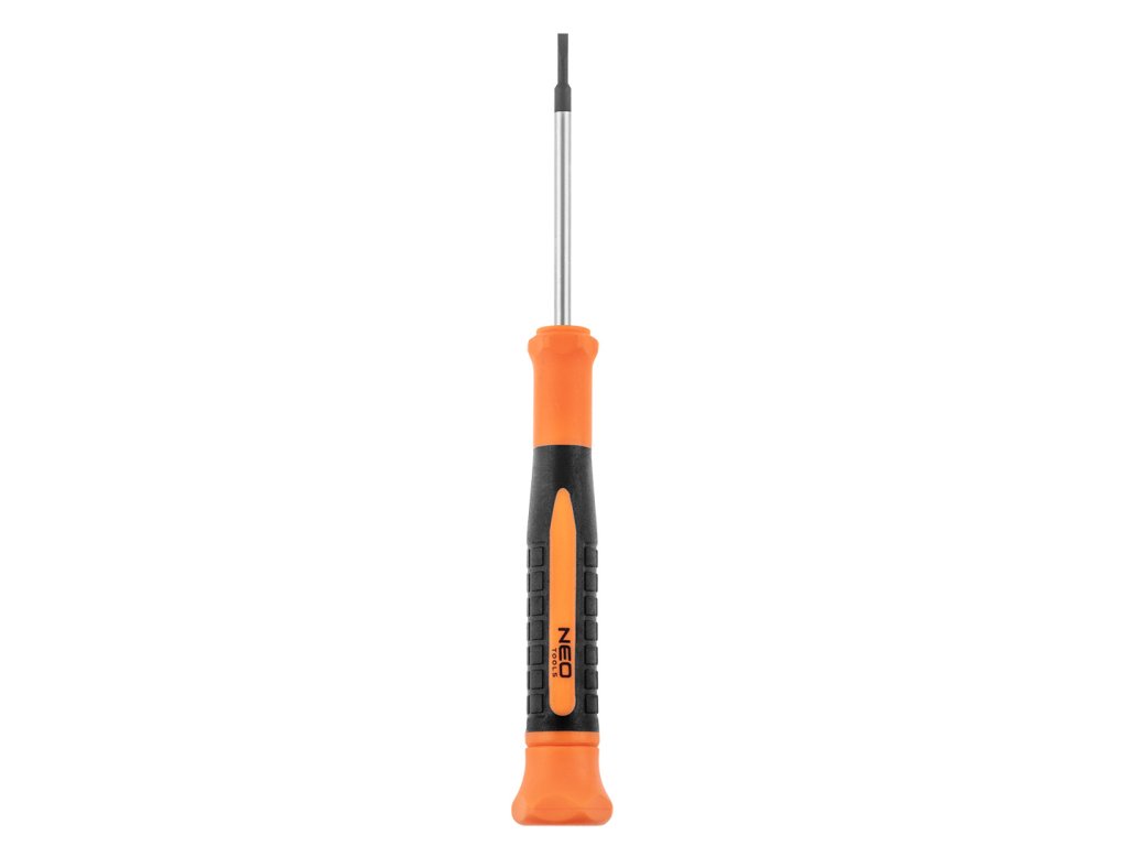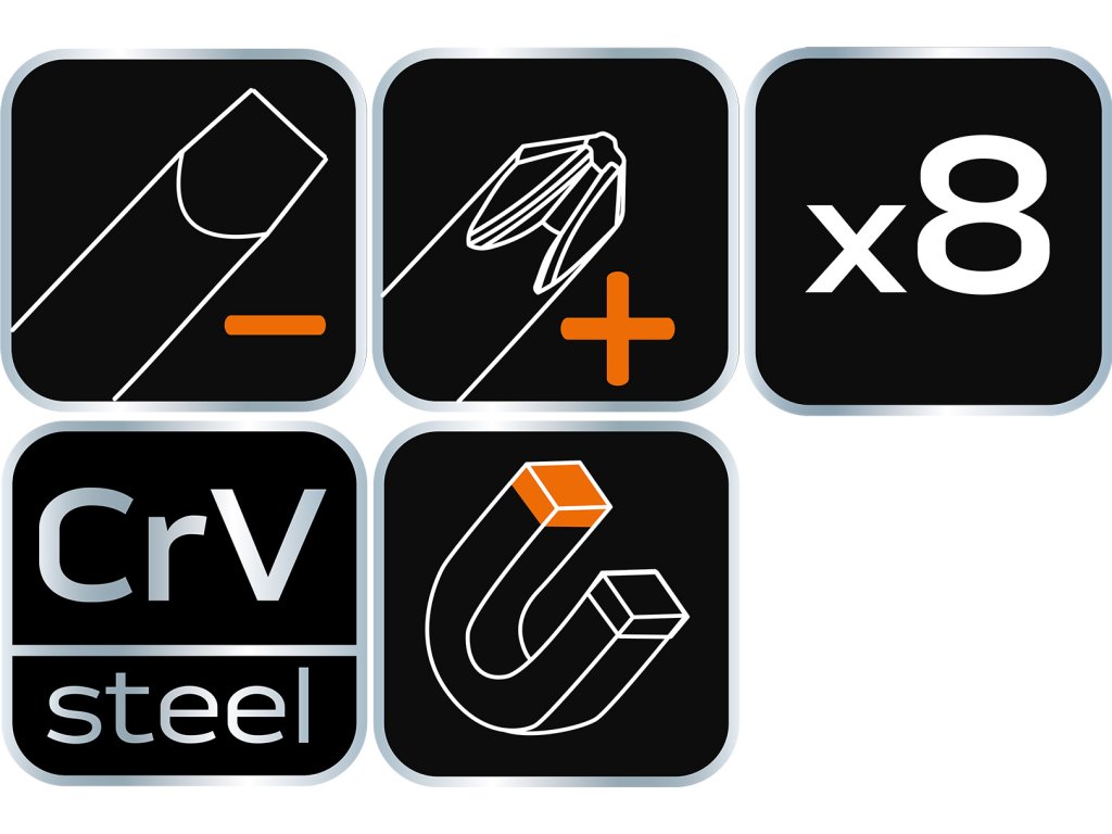Sada šroubováků Neo vyrobena z CrV oceli, která je odolná a trvanlivá i při vysokém zatížení. Rukojeť je potažena dvousložkovým materiálem, zároveň je ergonomická, trojúhelníkově tvarovaná a protiskluzová, takto je zajištěna maximální bezpečnost a pohodlí při práci. Prostor pro palec imitující otisk prstu zvyšuje pohodlnost úchopu. Na horní části rukojeti je označení, které usnadňuje výběr šroubováku pro konkrétní práci.
