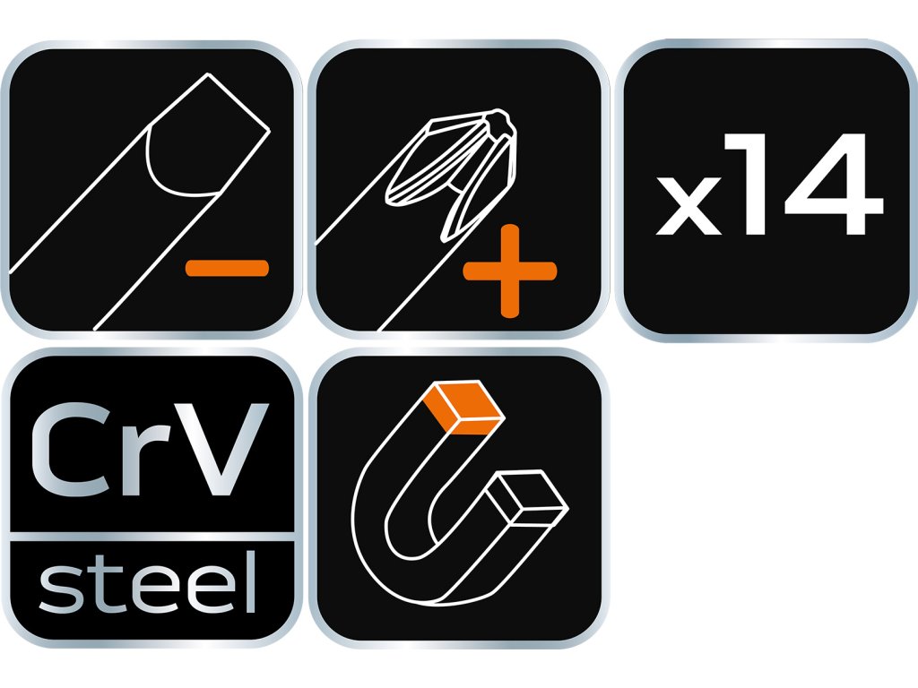 Sada šroubováků a šroubovacích bitů NEO (ref. 04-96) obsahuje 14 vysoce kvalitních položek. Čepel každého šroubováku je vyrobena z odolné CrV oceli, která zaručuje dlouhou životnost. Šroubováky mají magnetický hrot. Trojúhelníkový tvar rukojeti s tvarovanou opěrkou pro palec snižuje namáhání rukou během práce a usnadňuje dosažení optimálního točivého momentu. Rukojeť ze dvou materiálů zabraňuje klouzání v ruce a je odolná vůči chemikáliím, olejům a tukům. Značka NEO splňuje očekávání profesionálů.